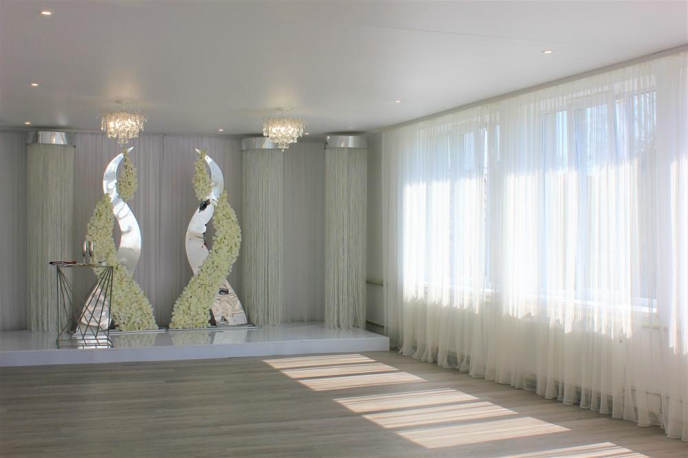 Фотозона виконана у світлих тонах, з спеціально облаштованим подіумом для наречених та надзвичайної краси інсталяціями із дзеркально-квіткових композицій, які додають загальному інтер’єру особливої вишуканості.