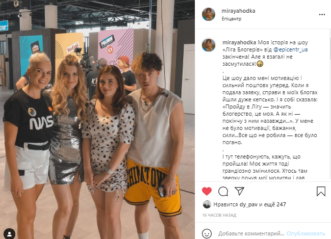 «Моя історія на шоу «Ліга Блогерів» від @epicentr_ua закінчена! Але я взагалі не засмутилася! Це шоу дало мені мотивацію і сильний поштовх уперед. Коли я подала заявку, справи в моїх блогах йшли дуже кепсько. І я собі сказала: «Пройду в Лігу — значить блогерство, це моє. А як ні — покінчу з ним назавжди...». У мене не було мотивації, бажання, сили... Все що не робила — все було погано. І тут телефонують, кажуть, що пройшла! Моє життя тоді грандіозно змінилося. Хтось там зверху почув мої молитви і дав шанс проявити себе. І я проявила!!!», - пише в своєму інстаграмі Мирослава.