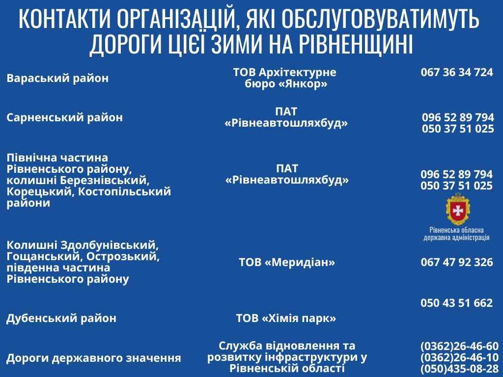 Також він додав, що відповідальні в області за експлуатаційне утримання доріг підрядні організації сформували відповідні запаси матеріалів і техніки та перебувають у «бойовій» готовності. Збережіть їхні контакти - на ілюстрації нижче.