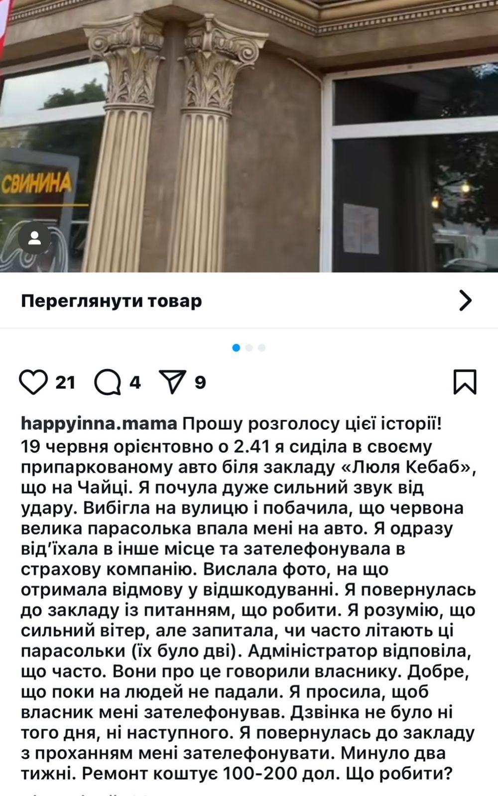 Під час перевірки з’ясувалося, що власник закладу самовільно встановив парасолі без необхідних дозволів і погоджень. Крім того, він не компенсував шкоду водієві та не вжив заходів, щоб уникнути подібних ситуацій у майбутньому.