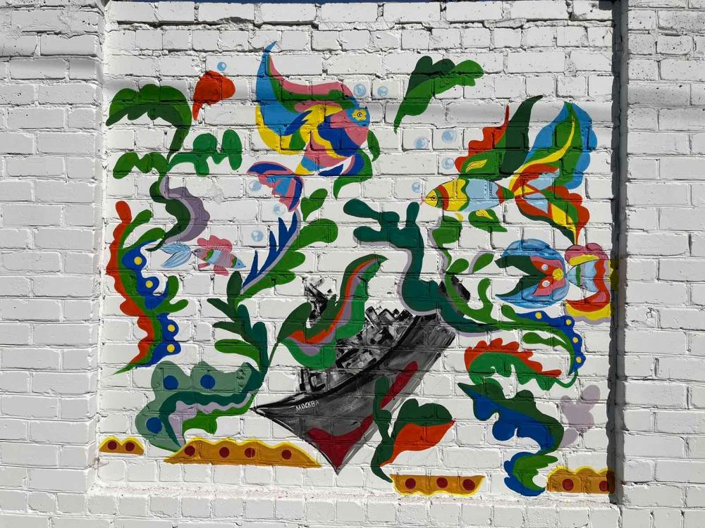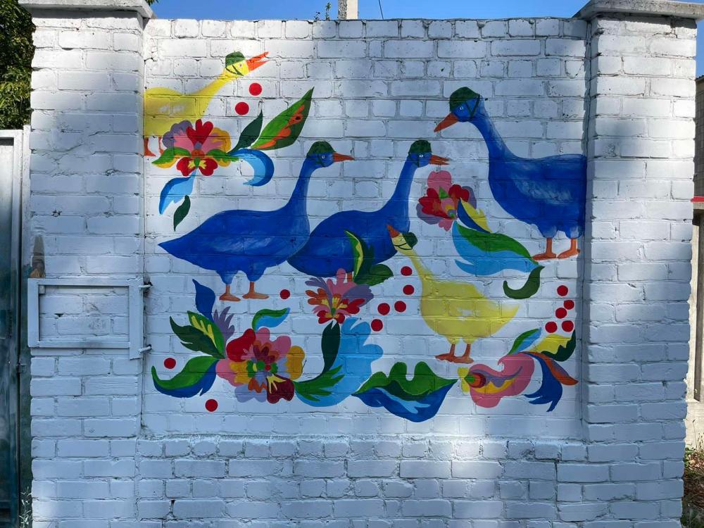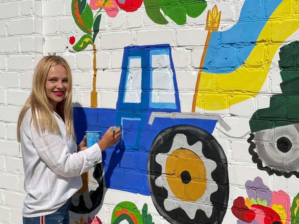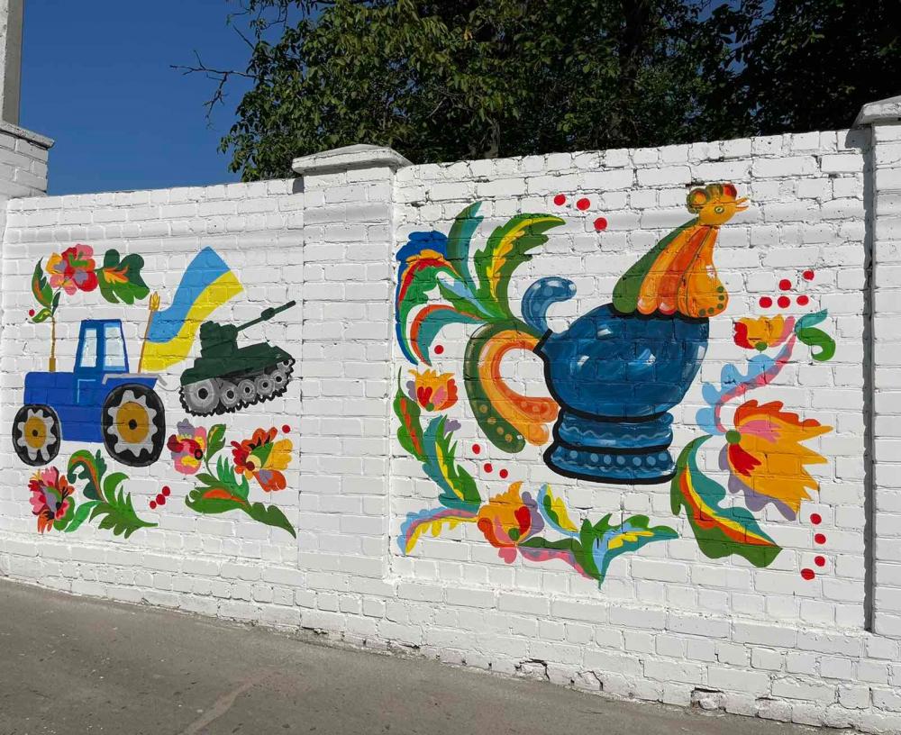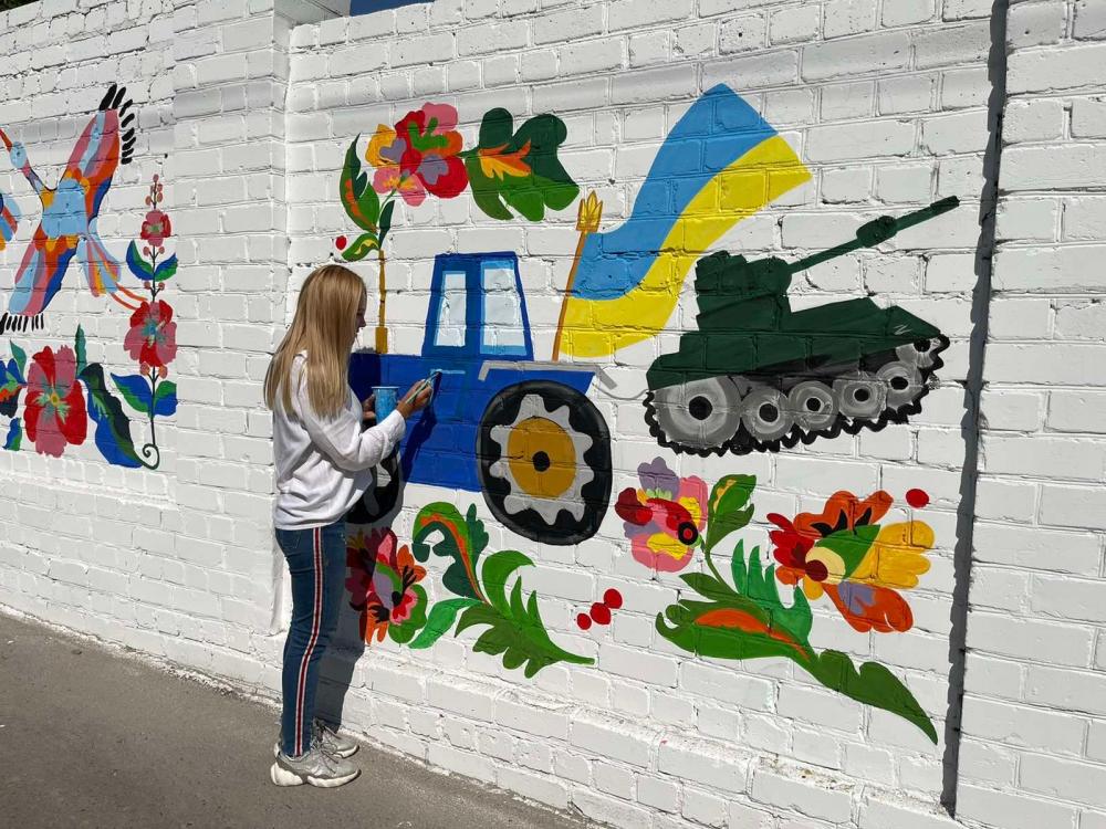Художниця Тетяна Журавель з Києва розповідає, що головна задумка - зобразити патріотичність нашого народу. На кожній окремій секції малює відому історію, яка трапилася під час війни. Це і соняшникове насіння та шолом ворога, куди пішов рускій корабель, вкрадений танк та бойові гуси.