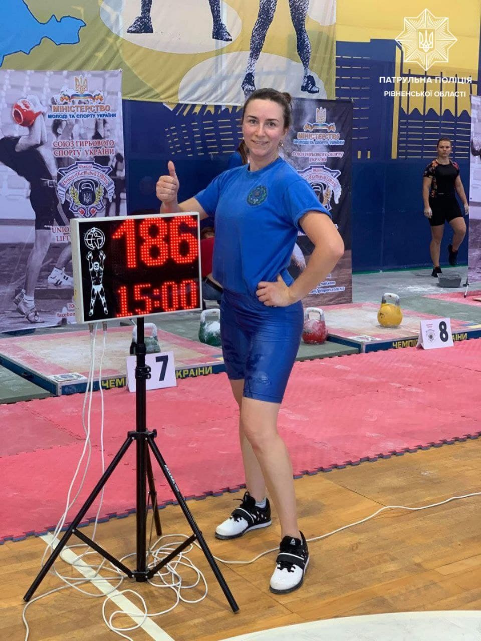 Інспектор зв'язків з громадськістю відділу організації несення служби в м.Сарни Оксана Рабош у перший день змагань у вправі класичний ривок отримала 1 місце у своїй ваговій категорії.