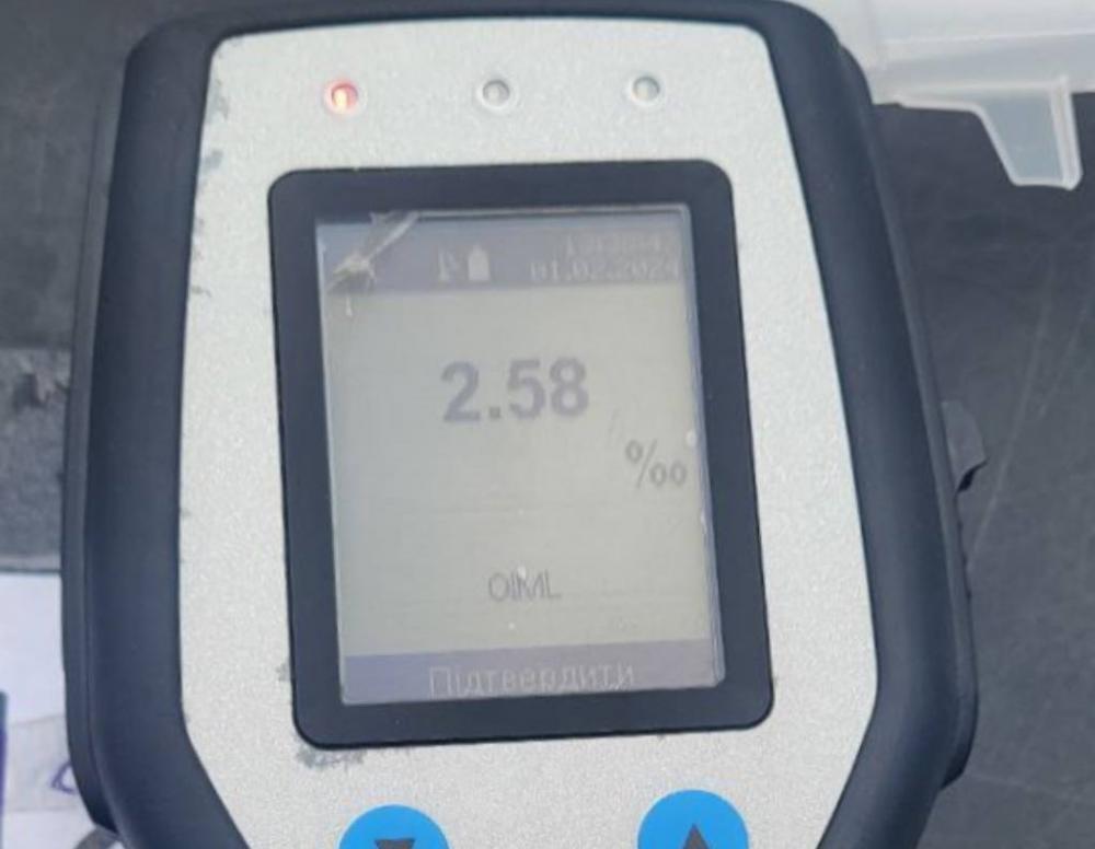 Виявилося, чоловік перебував у стані алкогольного сп'яніння. Огляд за допомогою алкотестера Драгер це лише підтвердив. Результат - 2,58.