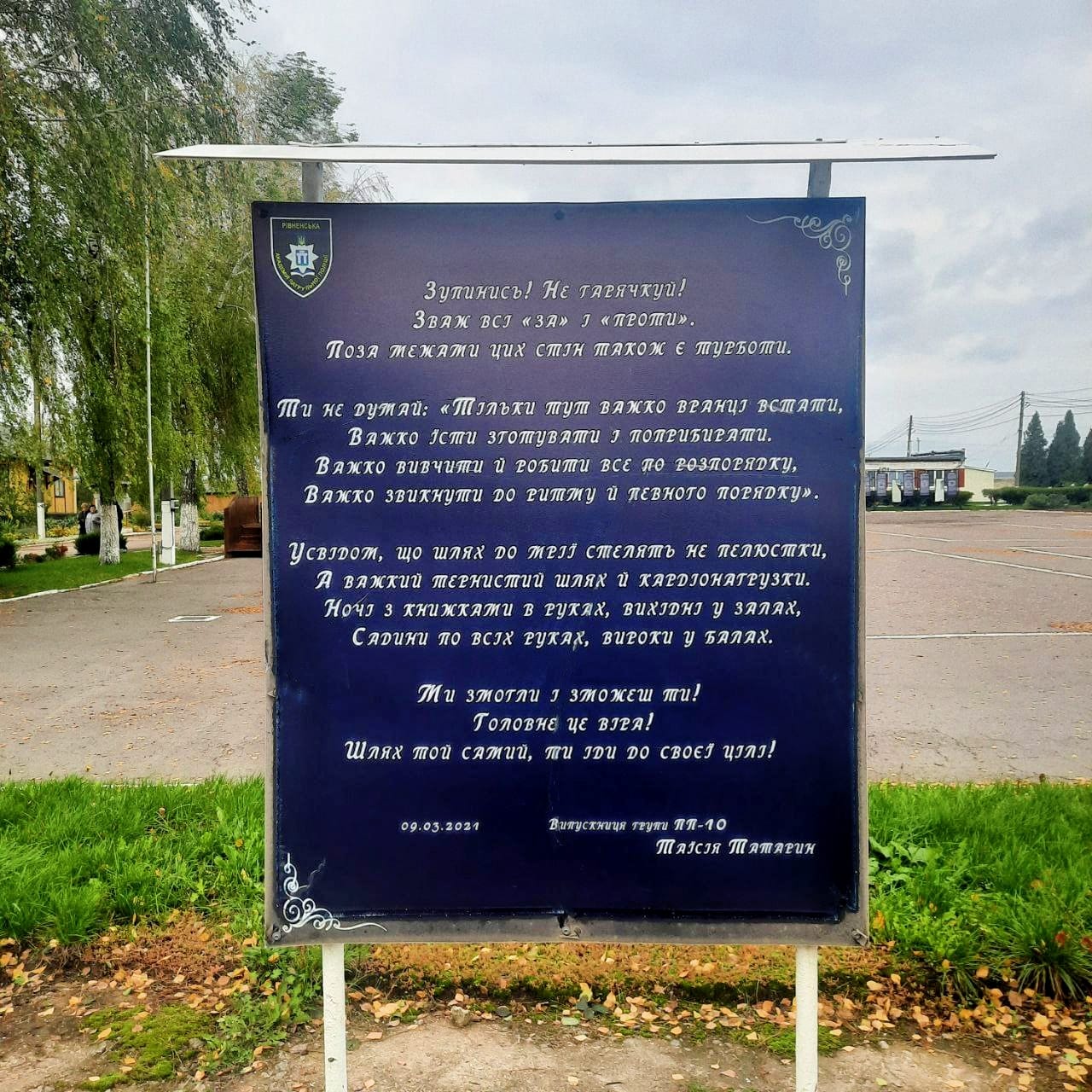 Зазначили, що на честь свого випуску дівчина написала вірш. Його було розміщено на плацу установи ще у 2021 році, задля мотивації та натхнення молодих поколінь патрульних поліцейських.