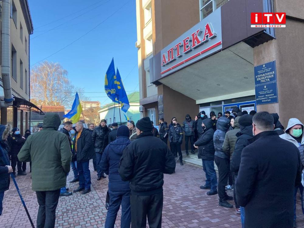 Під стінами зали засідань Рівнеради знову зібрались пікетувальники. Цього разу тримають плакати "Дайте грошей на самооборону".