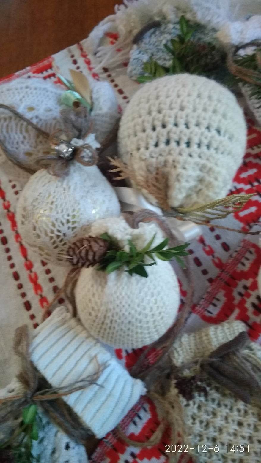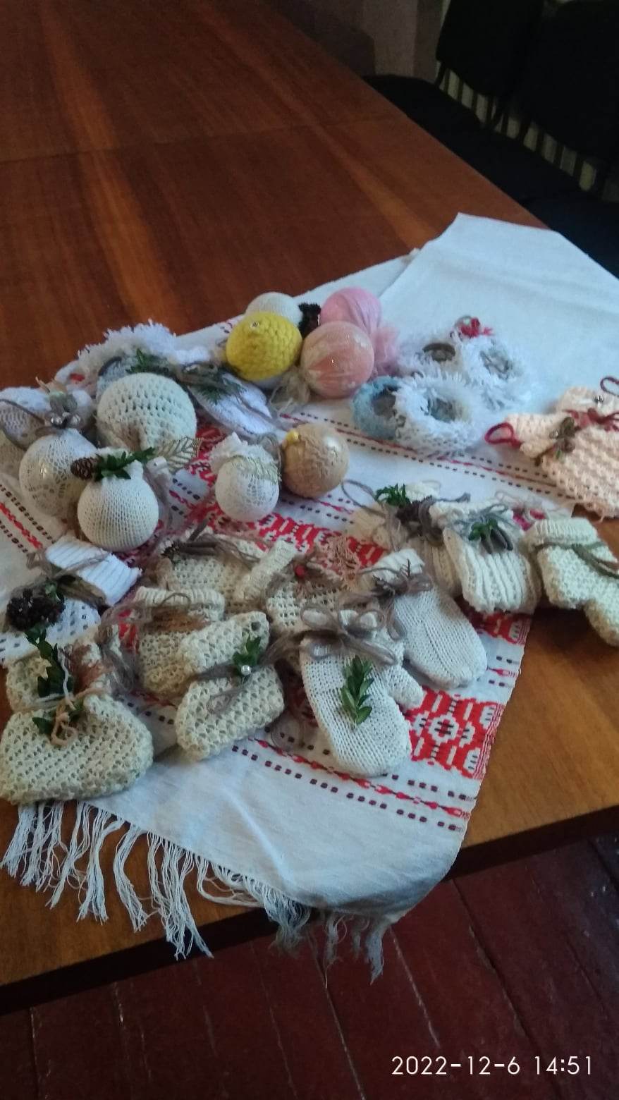 Ірина Мєдвєдіва тимчасово виїхала на Рівненщину через повномасштабне вторгнення рф в Україну. Тут вона продовжує створювати новорічні прикраси за допомогою в’язаних речей,стрічок,ниток,шишок і намистинок..Вирішила навчити цього і жителів Рівненщини.