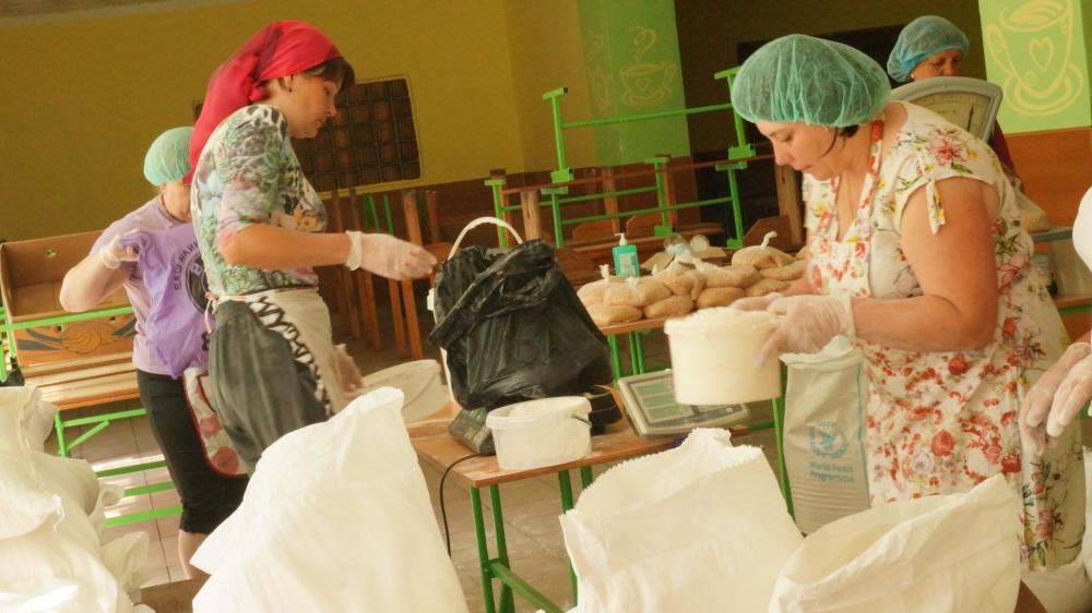 У міському ліцеї №2 для внутрішньо переміщених осіб, які проживають на території міста, облаштували пункт видачі продовольства. Розважувати та фасувати продукцію допомагають працівниці шкільної їдальні та дитячого садочка.