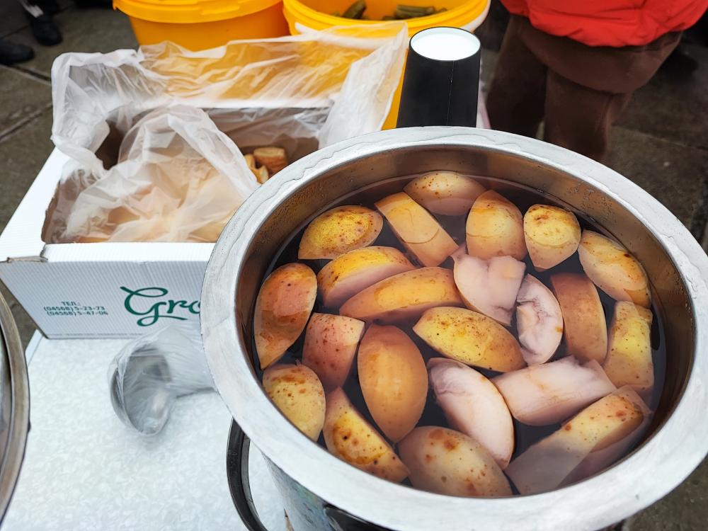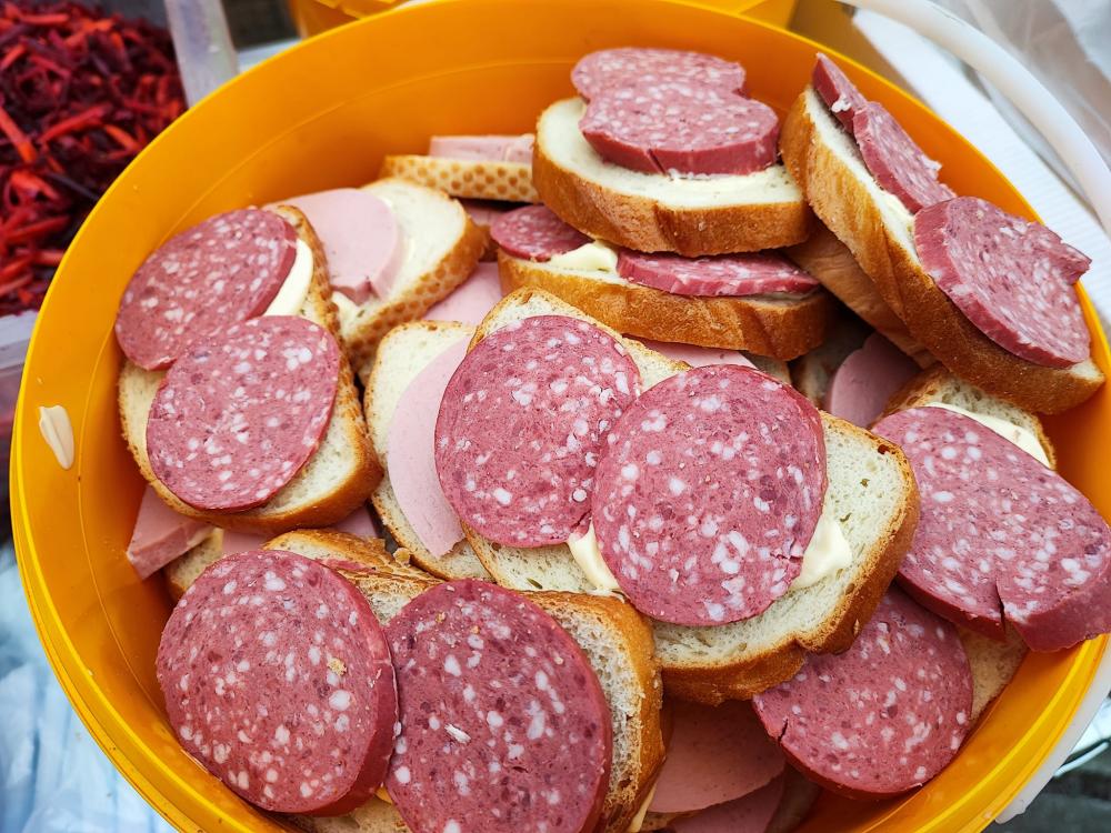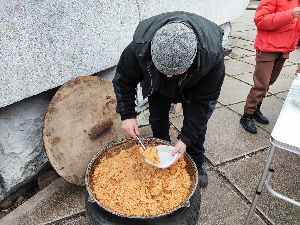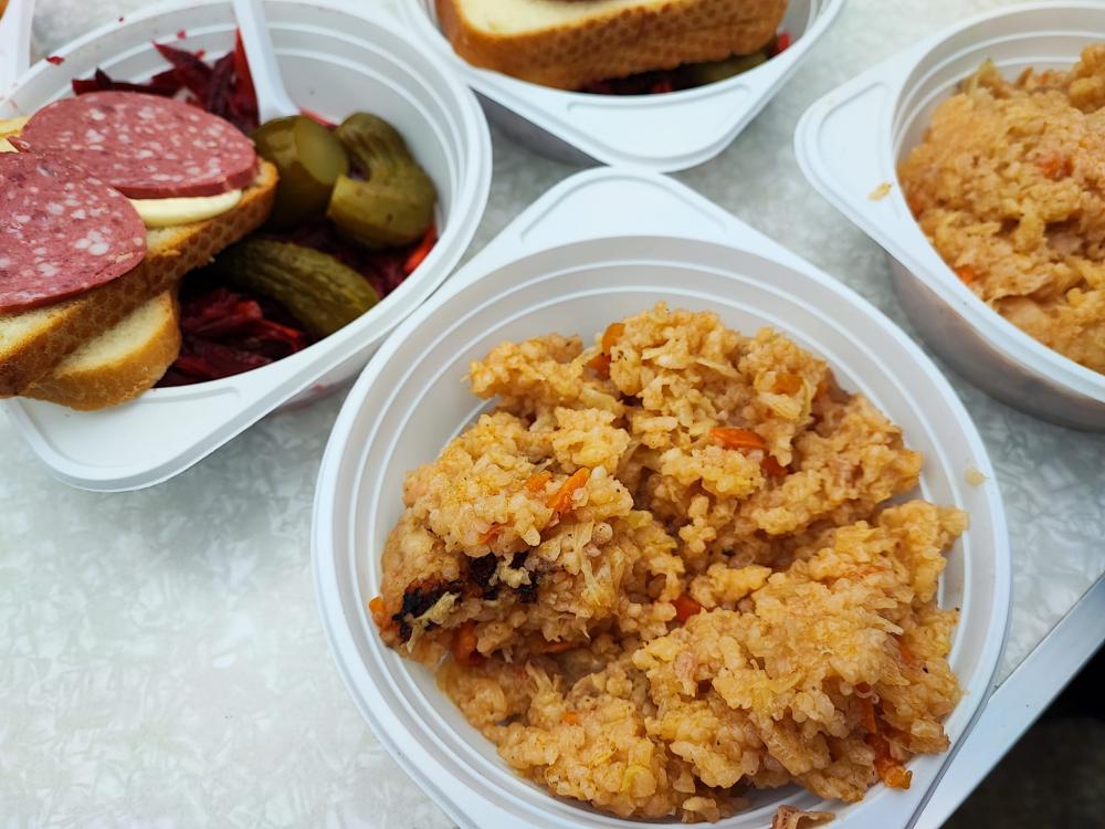 Пригощали потребуючих пловом з м'ясом, салатом з буряка, бутербродами, солодощами та узваром.
