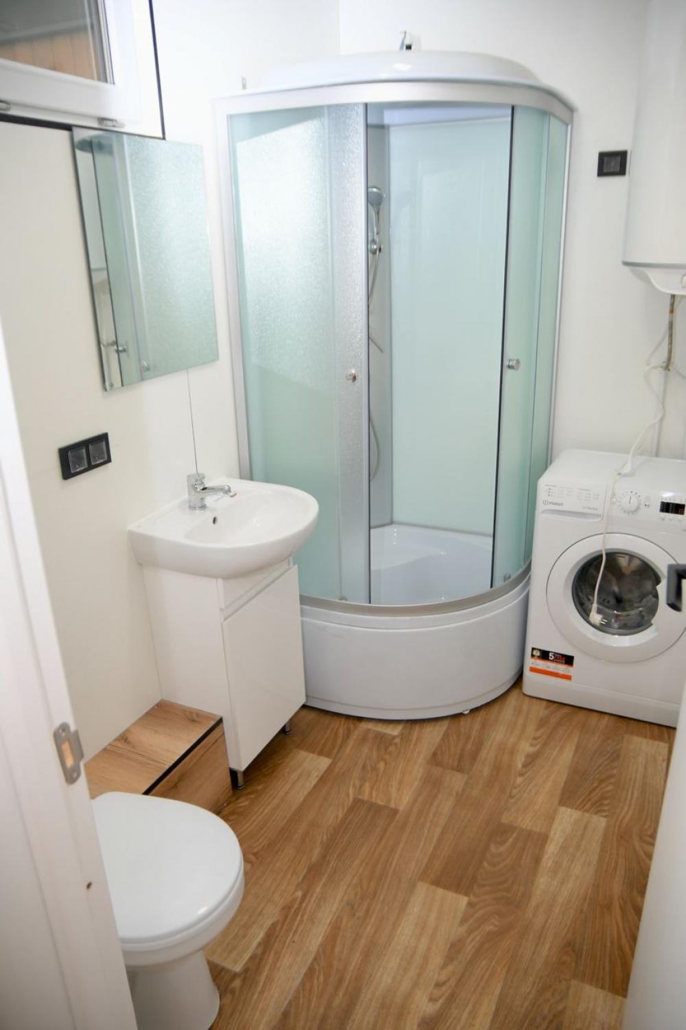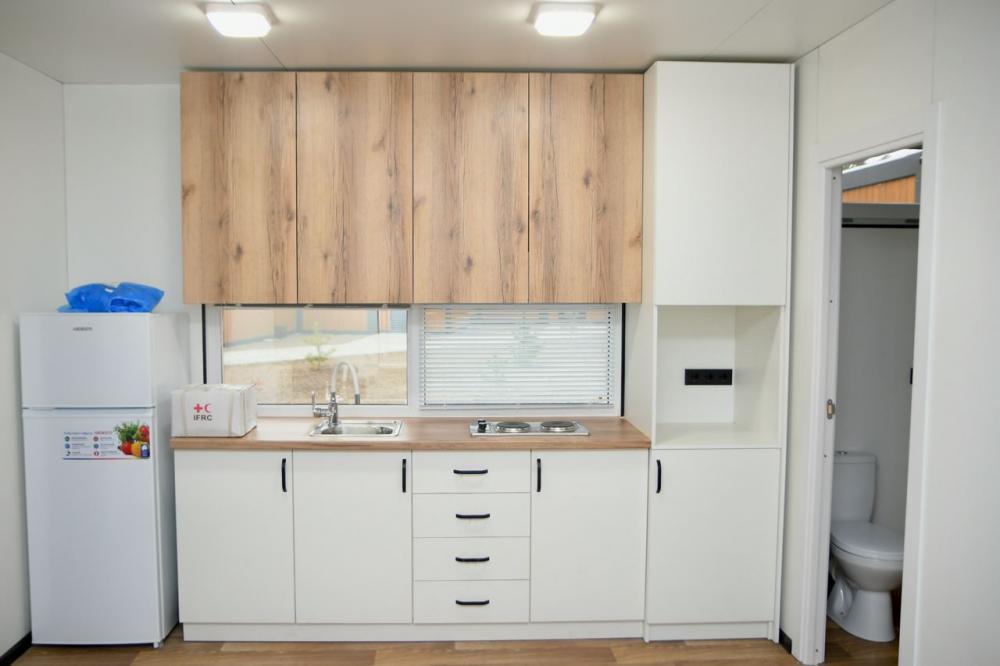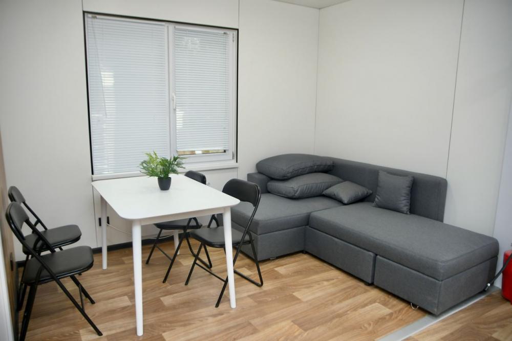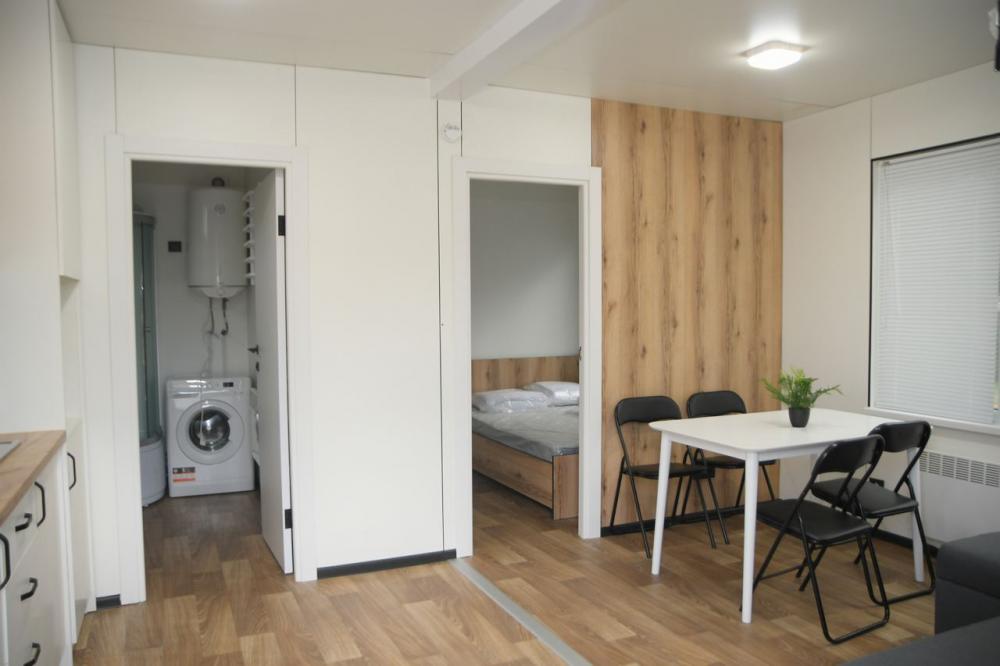Будиночки утеплені, витримують температуру до -40 градусів за Цельсієм. Мають автономне опалення. У них облаштована кухня, душова, є шафа, двоспальне ліжко та двомісний диван.