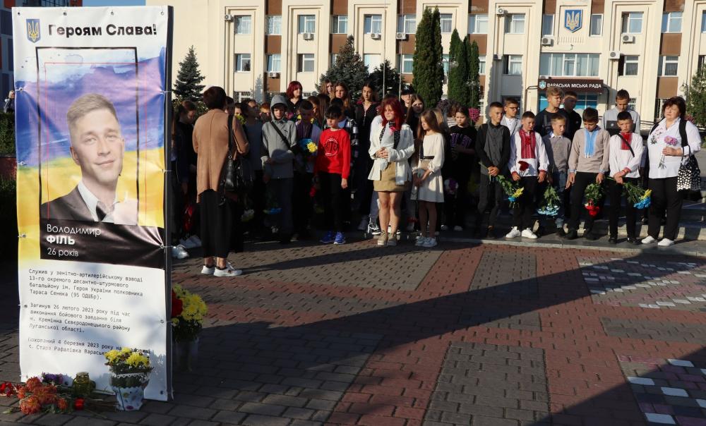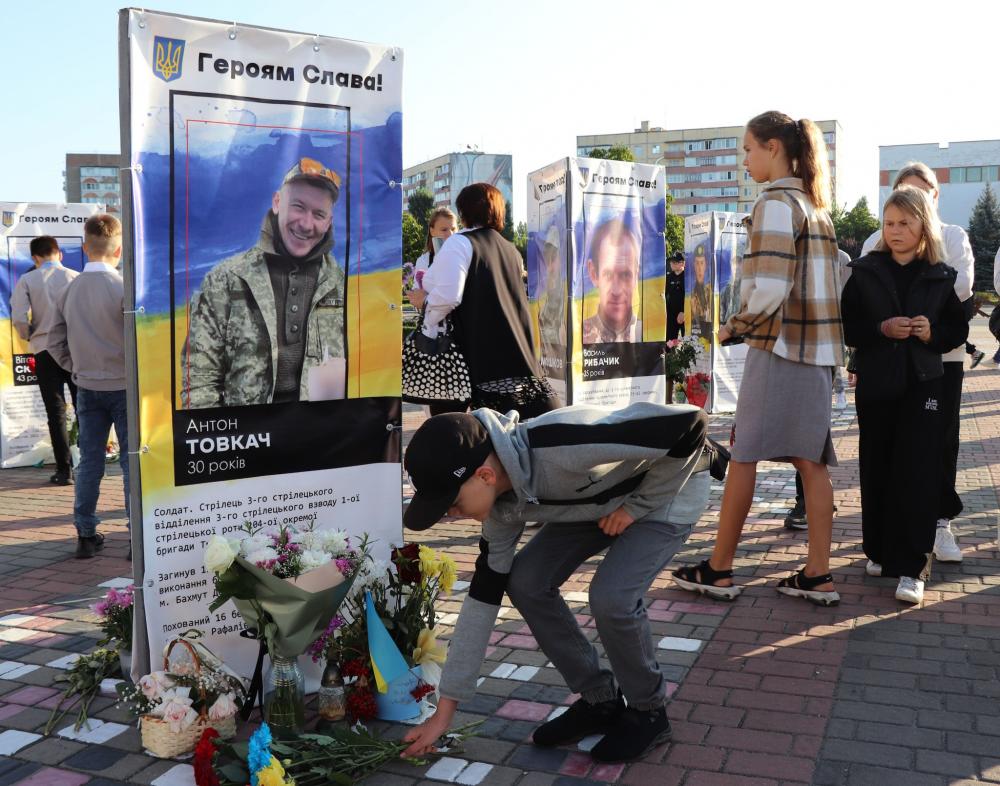 Аби висловити свою шану та подяку полеглим захисникам, перший урок учням 7-х класів Вараського ліцею №2 провели біля фото інсталяцій Героїв громади.