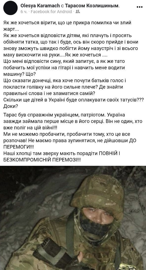 Тарас Козлишин був одним з польових командирів Добровольчого батальйону ОУН. Мав позивний – друг Карай. Вперше він пішов на Схід 2015-го, тричі був поранений.