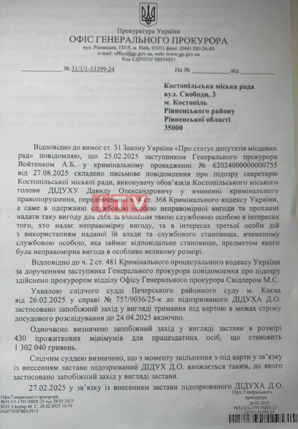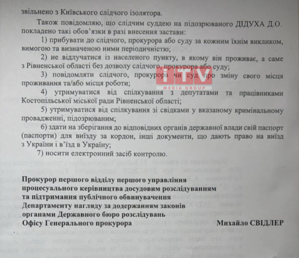 Виконувача обов'язків міського голови Костополя Давида Дідуха, якого підозрюють у вимаганні хабаря у вигляді земельної ділянки площею вартістю 1,3 млн грн, відпустили з-під варти.