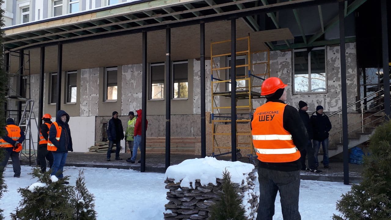 Роботи проводять комунальники рівненського ШЕУ. Не встигли як слід розпочати – довелося процес призупинити. Один із власників приміщення, до якого добудували терасу, забороняє розбирати накриття. Представлятися відмовляється.