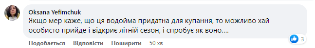 "Судячи з наявності дитячого майданчика і огороженого місця - це дитячий пляж, в усякому разі , так було завжди. Судячи з того, що робиться навколо - це болото- все заросло і голосять жаби. Нещодавно прочитала, що в наших водоймах купатися не можна. Мер спростував це і я вирішила подивитися. Старомильська це вже не Здолбунів чи тут не такі люди живуть? Хто притомний дозволить своїм дітям купатися в такий воді?", - обурюється здолбунівчанка Марина Горобець.