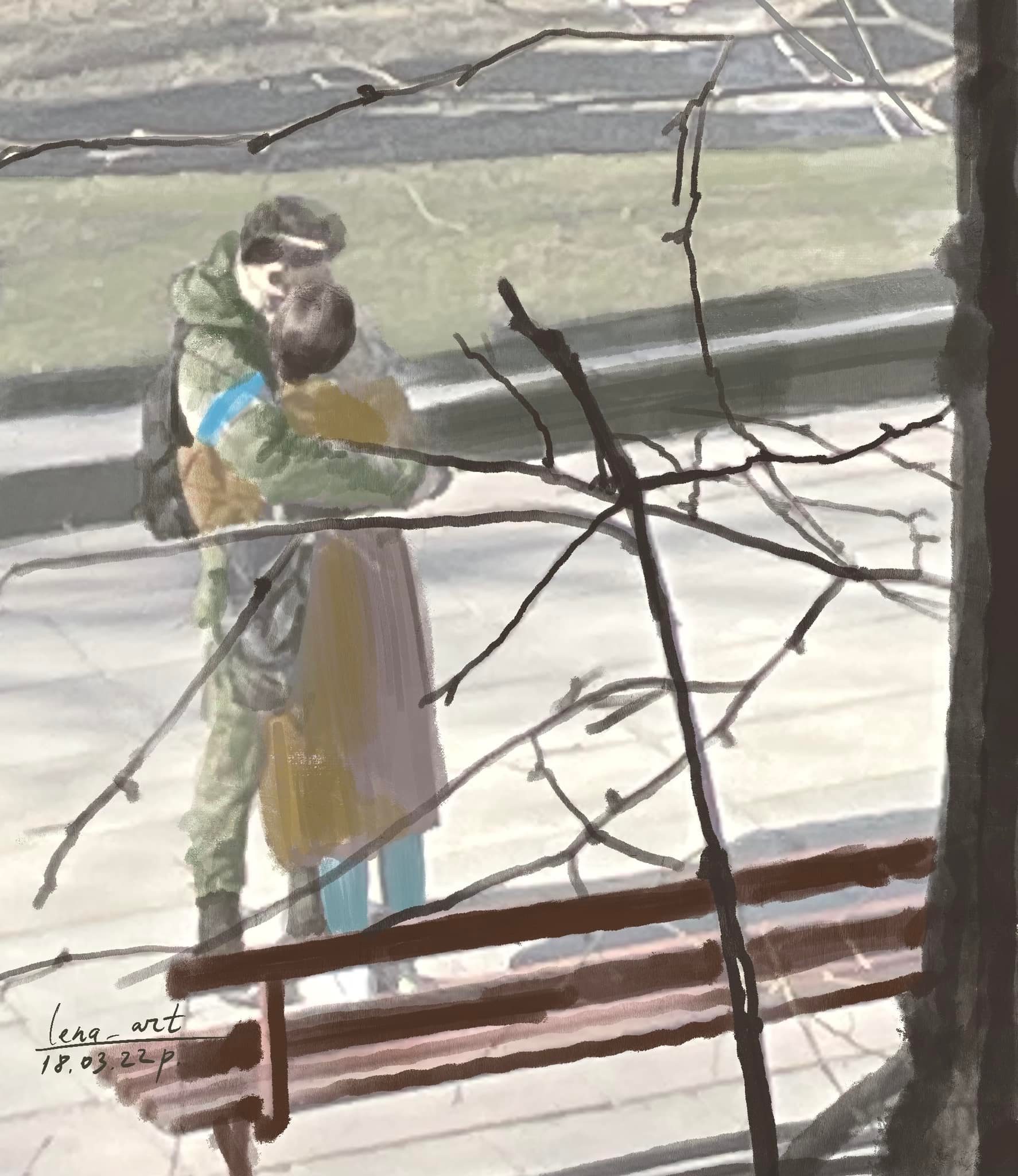 Побачила з балкону. Поки вони стояли обійнявшись, встигла зробити такий ескіз. Мої вибачення перед парою, що не попросила дозволу. Вперше малювала так швидко і з 3 поверху.