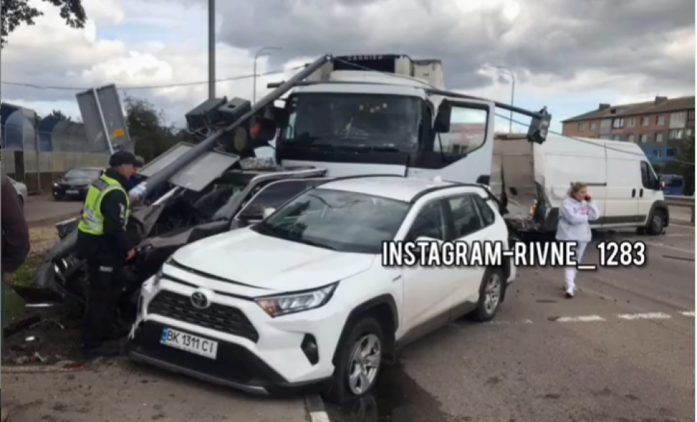 ДТП сталося в Білій Криниці. Вантажівка зіткнулася із двома легковими автомобілями BMW та Toyota, збито світлофор та дорожні знаки.