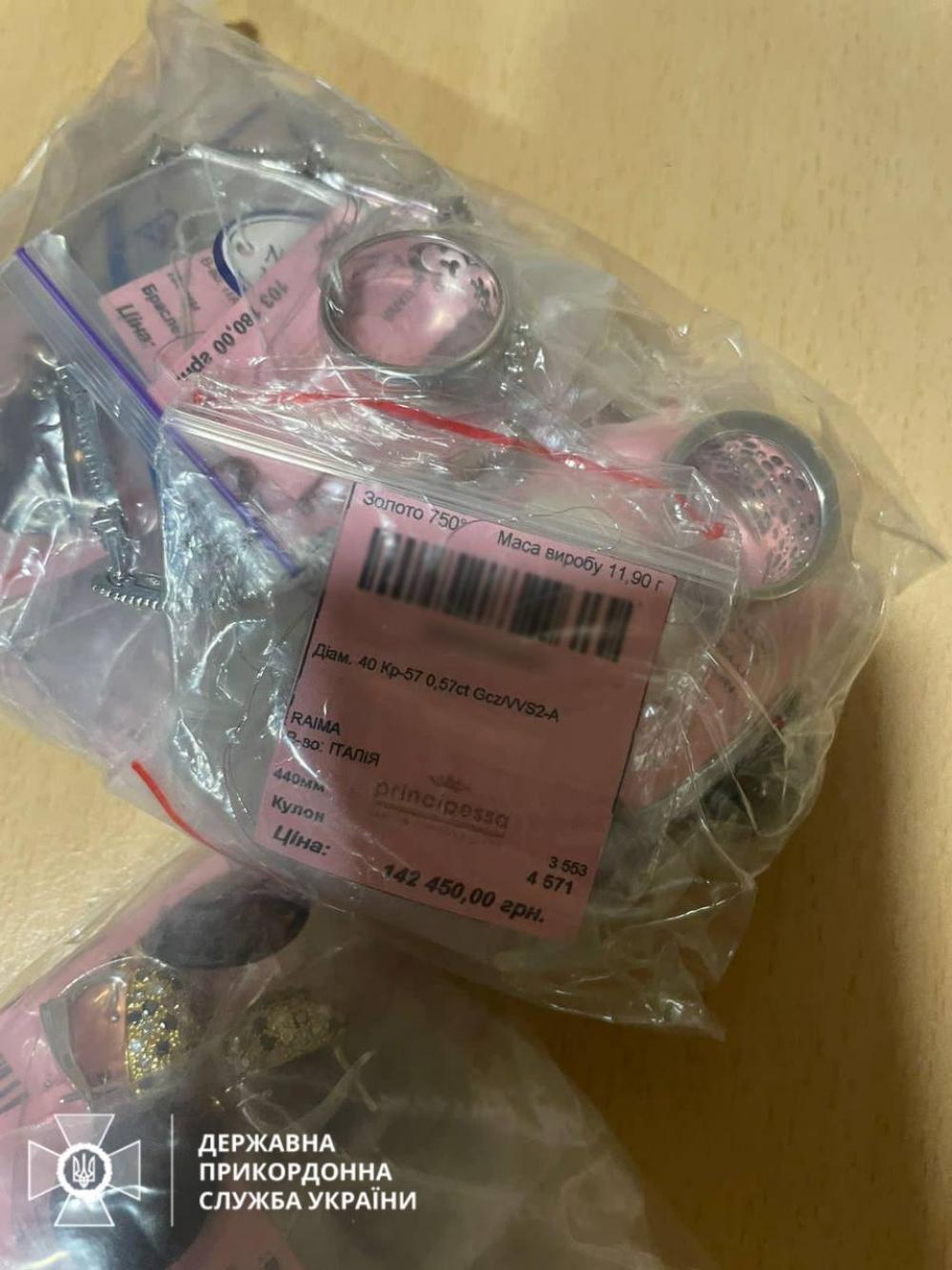 У результаті в кишенях та на тілі осіб виявили близько 100 поліетиленових пакетів із золотими прикрасами разом з цінниками.