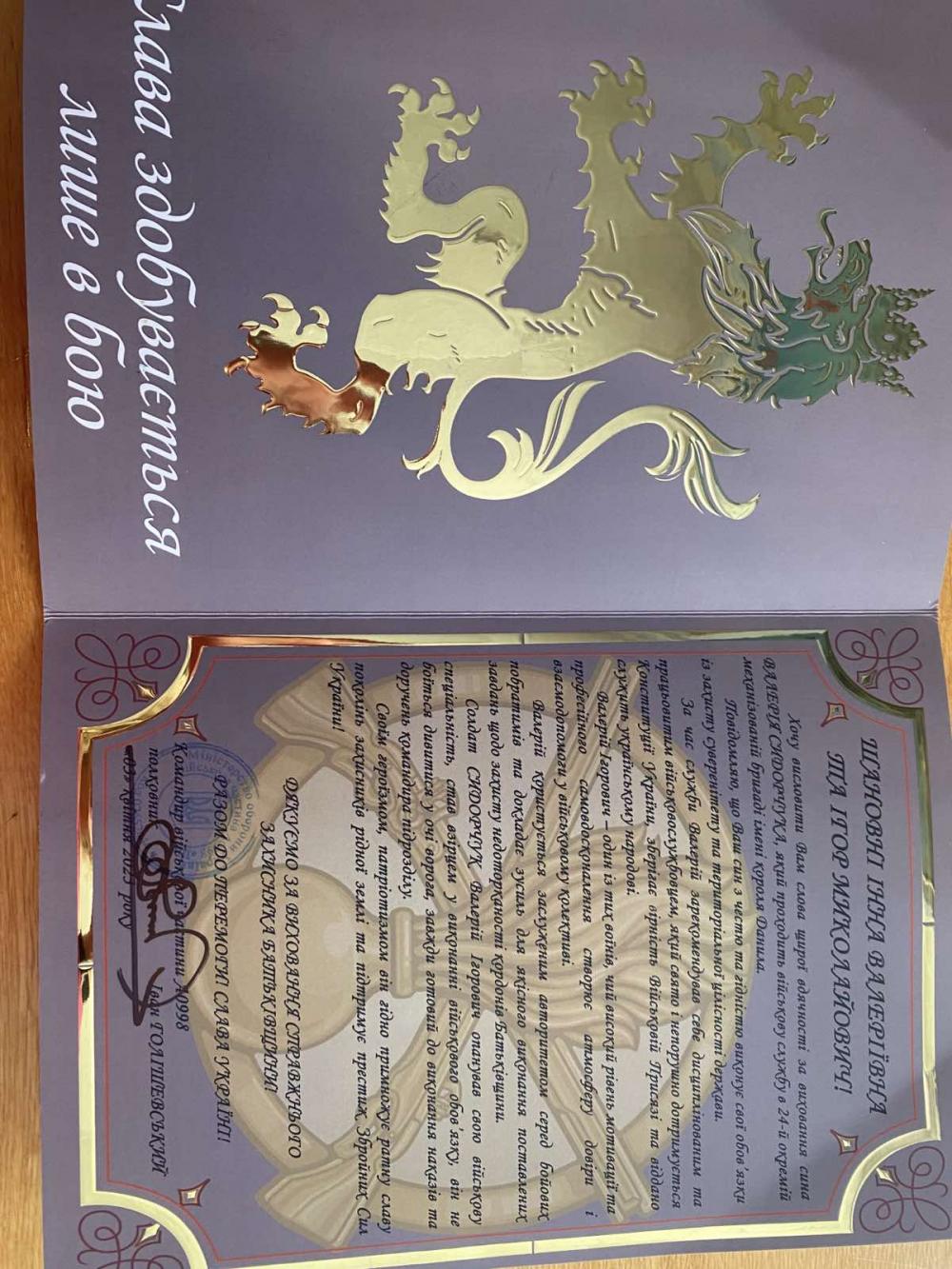 "Солдат Сидорчук Валерій Ігорович опанував свою військову спеціальність, став взірцем у виконанні військового обов`язку, він не боїться дивитися в очі ворога, завжди готовий до виконання наказів та доручень командира підрозділу. Валерій користується заслуженим авторитетом серед бойових побратимів та докладає зусиль для якісного виконання поставлених завдань щодо захисту недоторканості кордонів Батьківщини. Своїм героїзмом, патріотизмом він гідно примножує ратну славу поколінь захисників рідної землі та підтримує престиж Збройних Сил України", - йдеться у повідомленні.