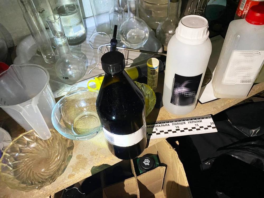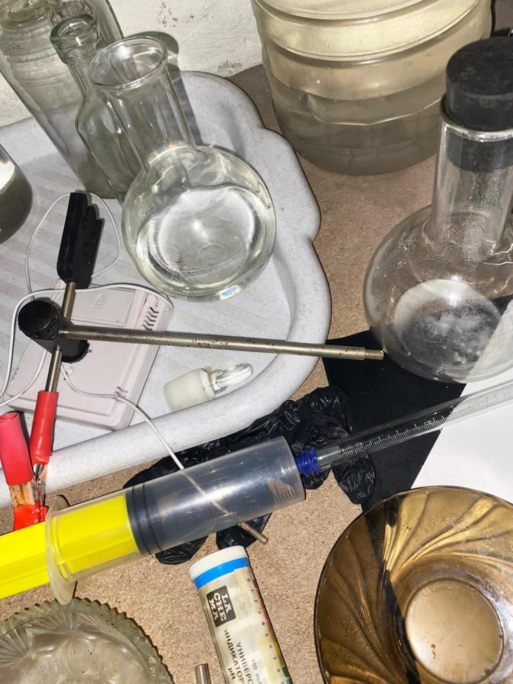 На території домогосподарства заявника у підвальному приміщенні поліцейські виявили та вилучили обладнання для виготовлення наркотичних речовин, порошкоподібну речовину, рідину схожу на соляну та сірчану кислоту.
