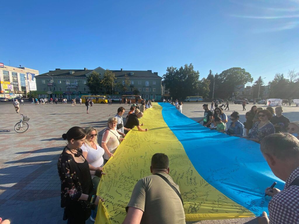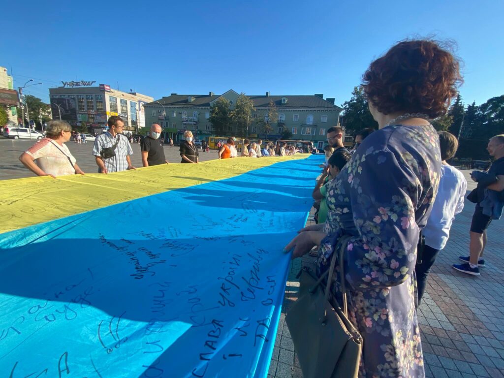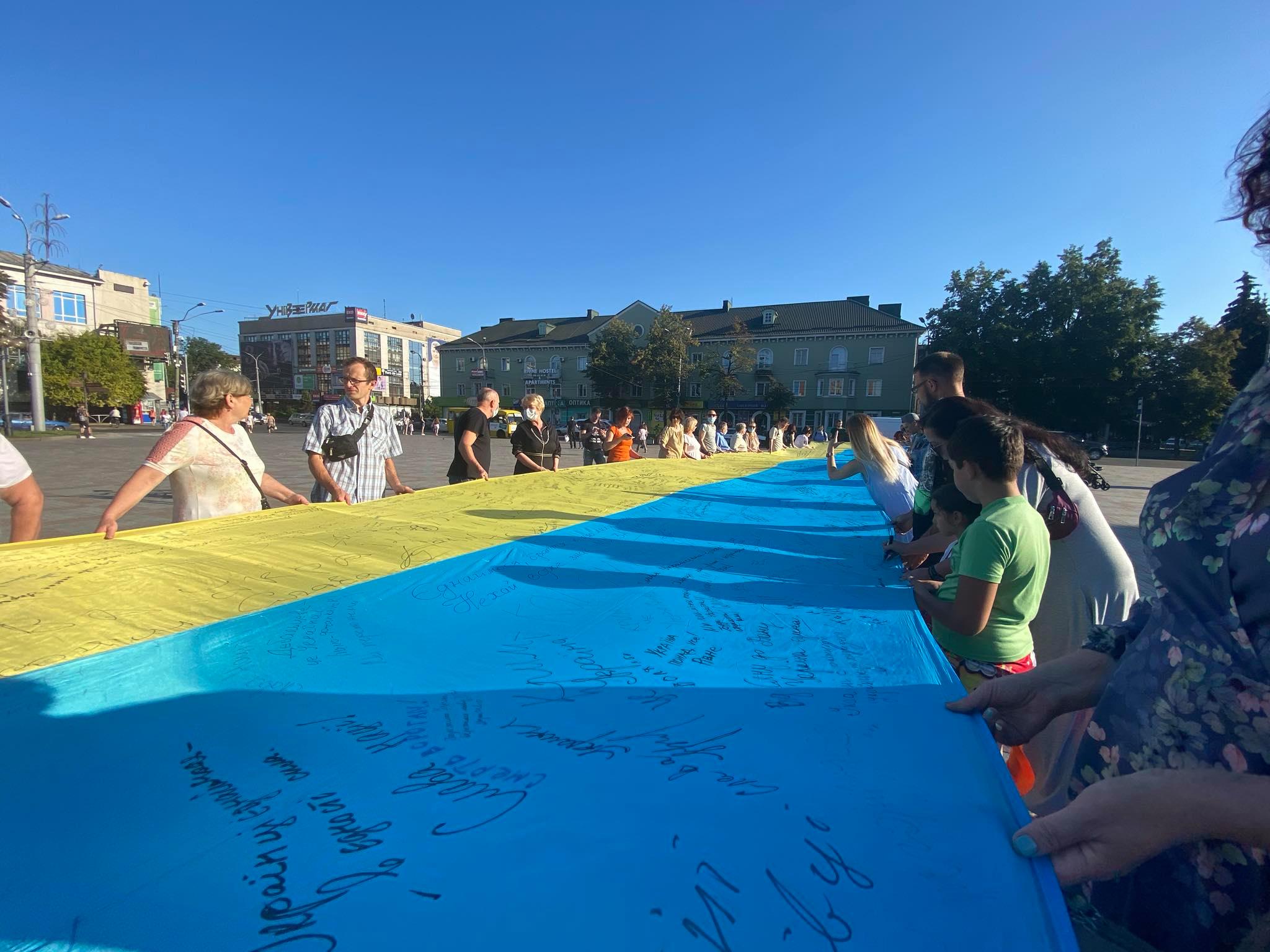 Акція «Прапор Єдності» — це один з етапів підготовки до Дня Незалежності України. Міста-учасники передають між собою 20-метровий стяг України, на ньому пишуть побажання один одному.