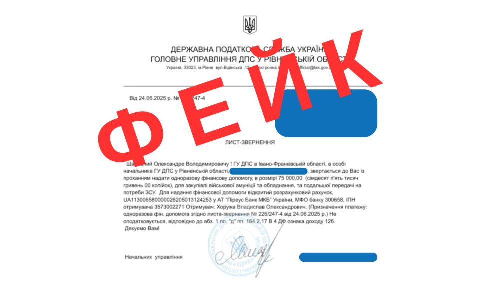 "Це шахрайство! Наголошуємо, що посадові особи органів ДПС діють виключно в межах повноважень та в межах чинного законодавства України і не можуть звертатися до платників податків із подібними проханнями.