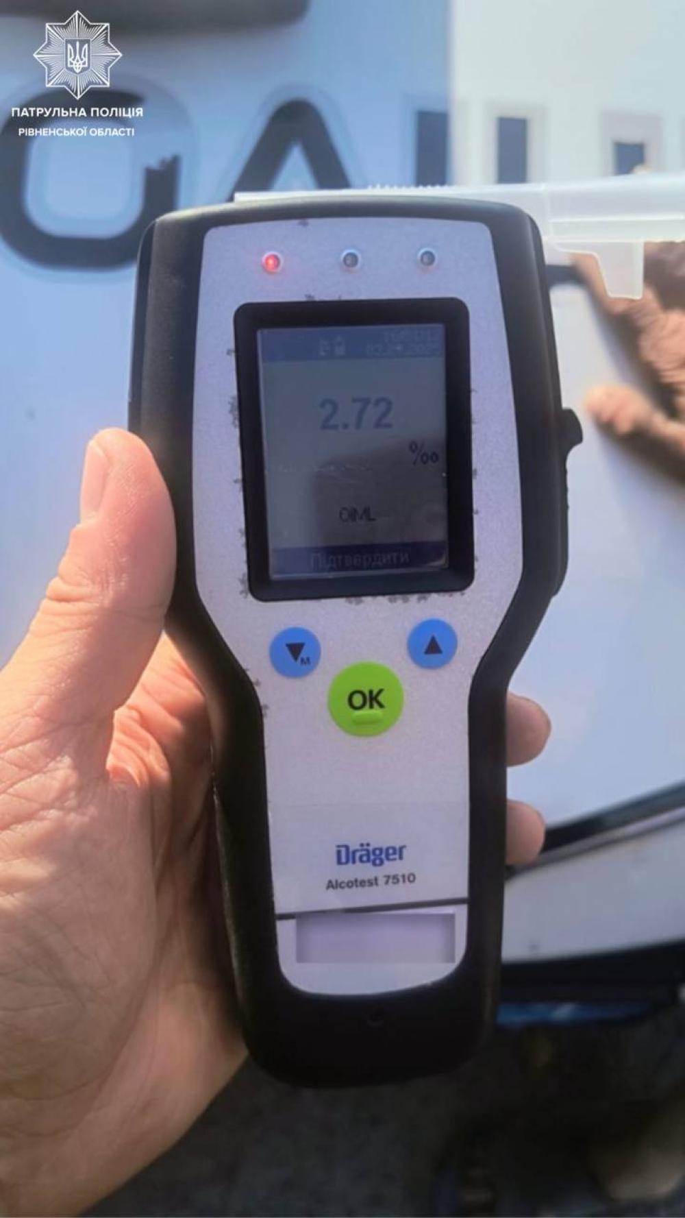 Огляд за допомогою алкотестера лише підтвердив те, що водій нетверезий. "Драгер" показав 2,72 проміле алкоголю, що у 13 разів більше за допустиму норму.