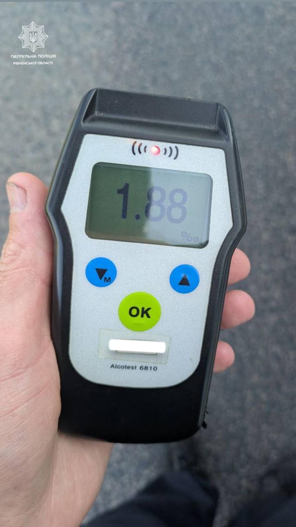 Патрульні виявили у 20-річного водія Volkswagen Caddy ознаки алкогольного сп’яніння й запропонували пройти огляд за допомогою алкотестера. Результат виявився позитивним — 1,88 проміле.