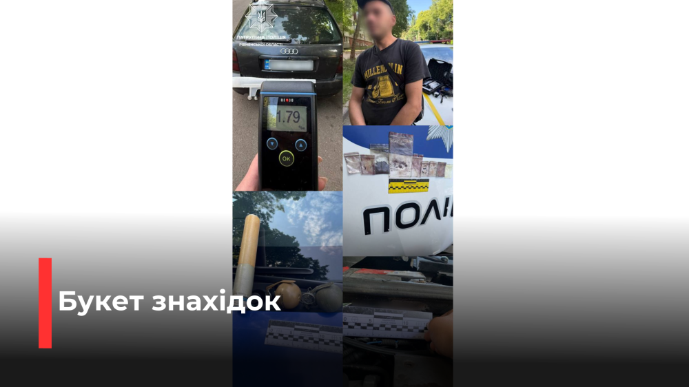 Окрім того, поліцейські перевірили авто. У салоні виявили зіп-пакети, ймовірно, з прекурсорами для виготовлення наркотичних речовин, та один зіп-пакет із залишками кристалоподібної речовини, ззовні схожої на наркотичну. Уже на задньому сидінні інспектори помітили наплічну сумку, в якій знаходилися бойові гранати та сигнальна хімічна ракета.