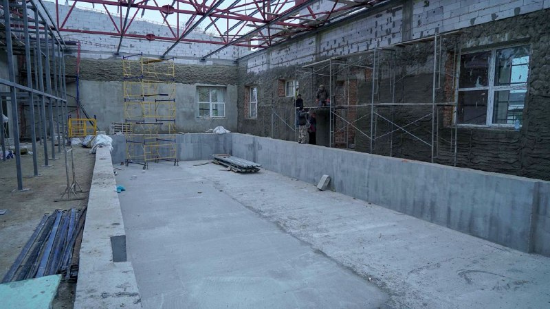 Як повідомляють у Рівненській ОДА, уже закінчили роботи по електриці, сантехніці та вентиляції. Також забетонували чашу басейну, замінили вікна. Наразі тривають роботи з накриття даху та облицювання плиткою.