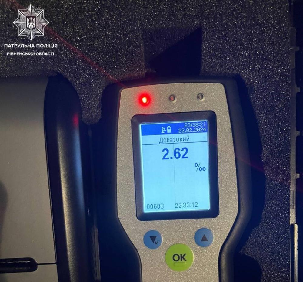 Під час перевірки документів у водія правоохоронці помітили ознаки алкогольного сп’яніння. Чоловік погодився пройти огляд на місці, результат позитивний — 2.62 проміле. До того ж патрульні з'ясували, що керманич не отримував посвідчення водія.