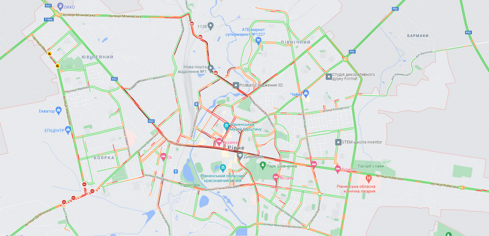 Від самого ранку Рівне скували затори. Так, найбільш ускладнений рух спостерігається по вул. Кн. Володимира, особливо на перехресті з вул. Шухевича, також найбільші тягучки утворились на центральній вулиці - Соборній, біля центрального ринку на вул. Арндта.