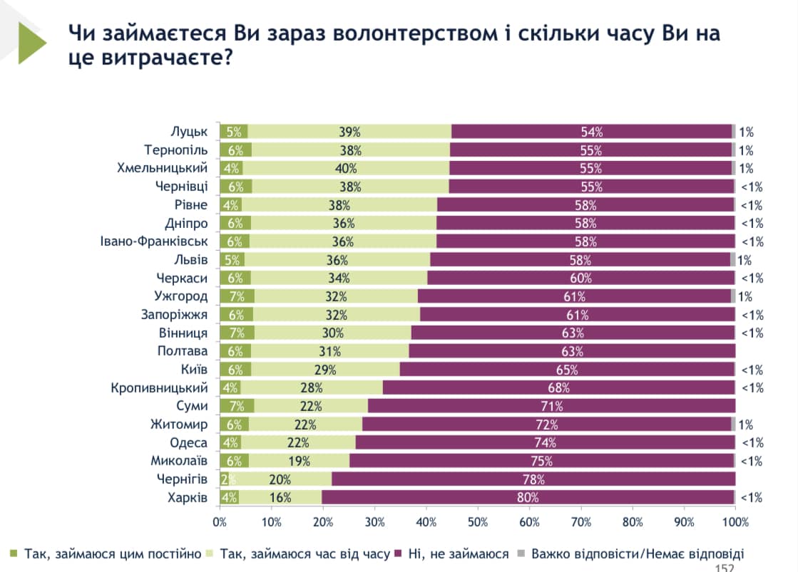 Відтак, Рівне посіло 5 місце. Попереду опинилися Луцьк, Тернопіль, Хмельницький та Чернівці. Там на питання «Чи займаєтеся ви зараз волонтерством?» відповіли 39, 38, 40 та 38% місцевих мешканців відповідно.