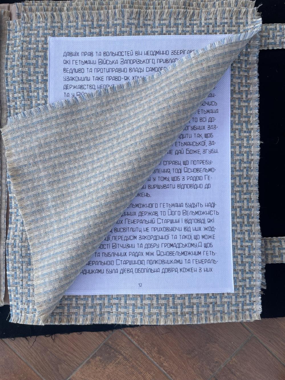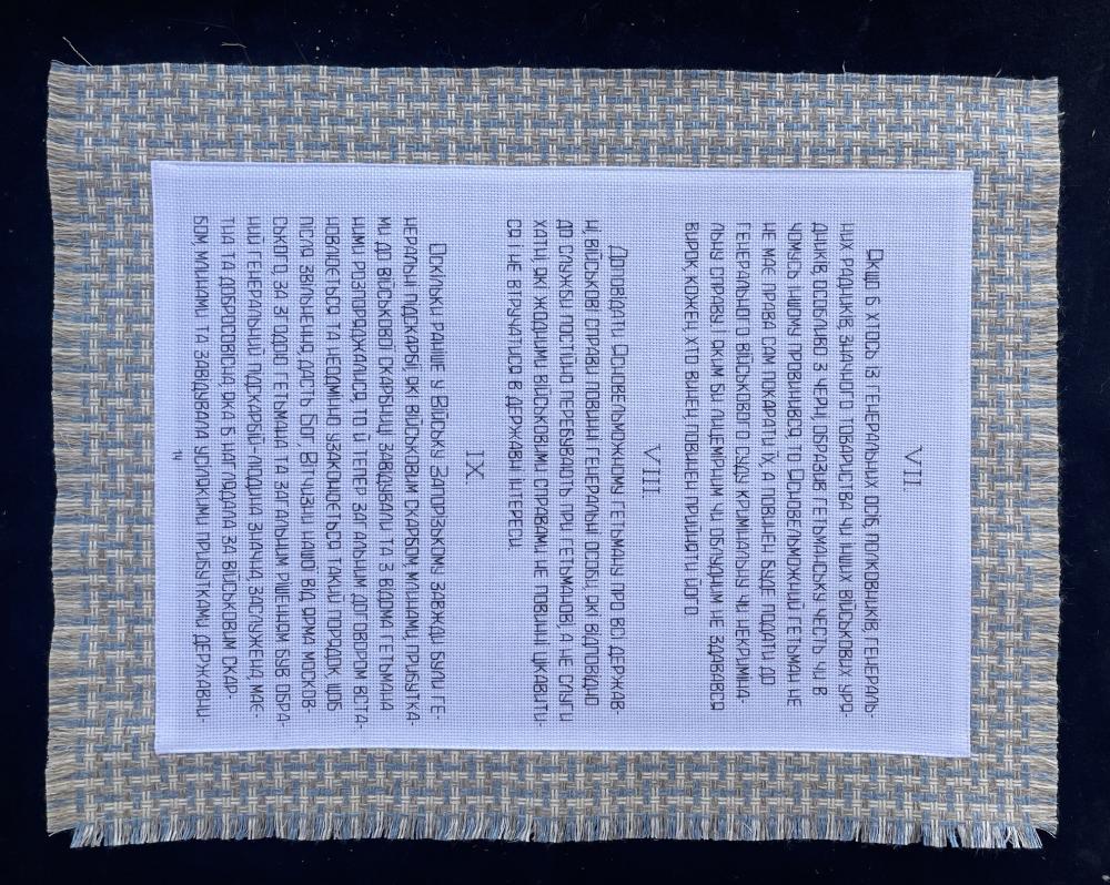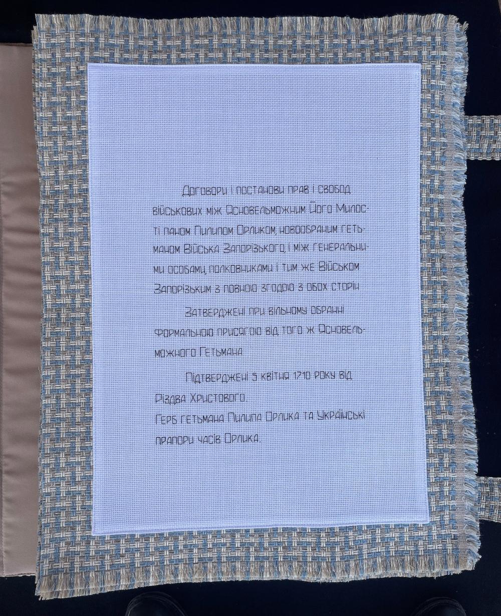 «Зміст цього історичного акту, яким був регламентований майбутній розвиток України, перегукується із нашими тривожними днями, ‒ сказала майстриня. ‒ Коли я вишивала його преамбулу, то усвідомлювала, що у ній висловлені наші сьогоднішні надії... На це вказують, наприклад, умови, за яких українська держава житиме щасливо: «…щоб після звільнення, дасть Бог, Вітчизни нашої від ярма московського…»; «…тому, як заспокоїться наша Вітчизна від смути воєнної і після звільнення її, дай Боже, від підданства московського…»; «…після звільнення Вітчизни від іга московського…».