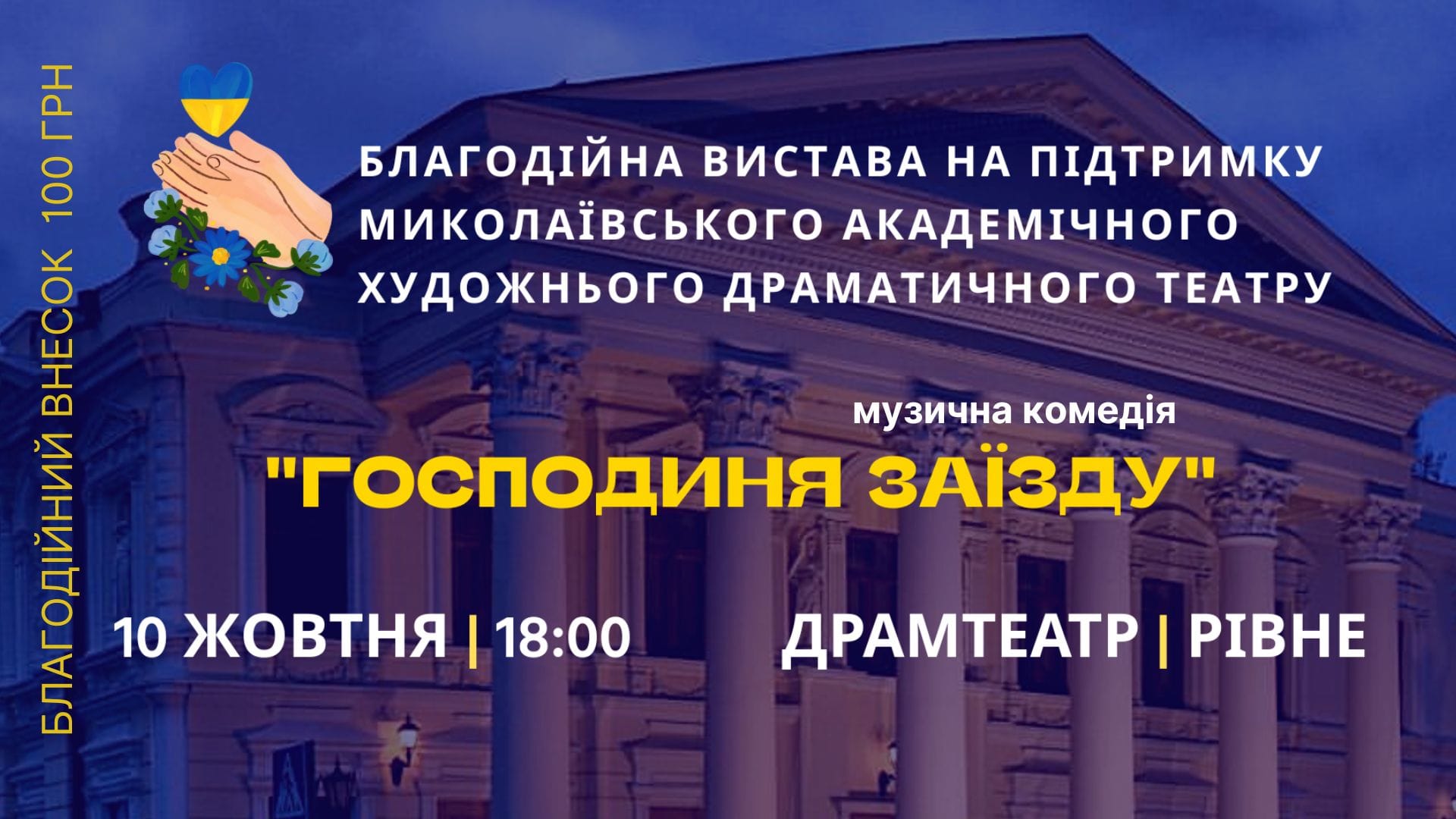 Актори зіграють комедію «Господиня заїзду». Усі кошти, зібрані під час неї, рівненські актори віддадуть колегам з Миколаєва. Адже на сьогодні це єдиний театр в Україні, який працює недалеко від лінії фронту. Там навіть відкрили 100-ий ювілейний сезон, зігравши виставу на сцені, облаштованій в укритті.