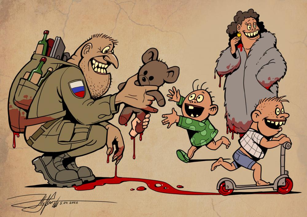 Художник-карикатурист Юрій Журавель показав, як уявляє повернення в сім'ю російського папочки з кривавими «подарунками» з України.