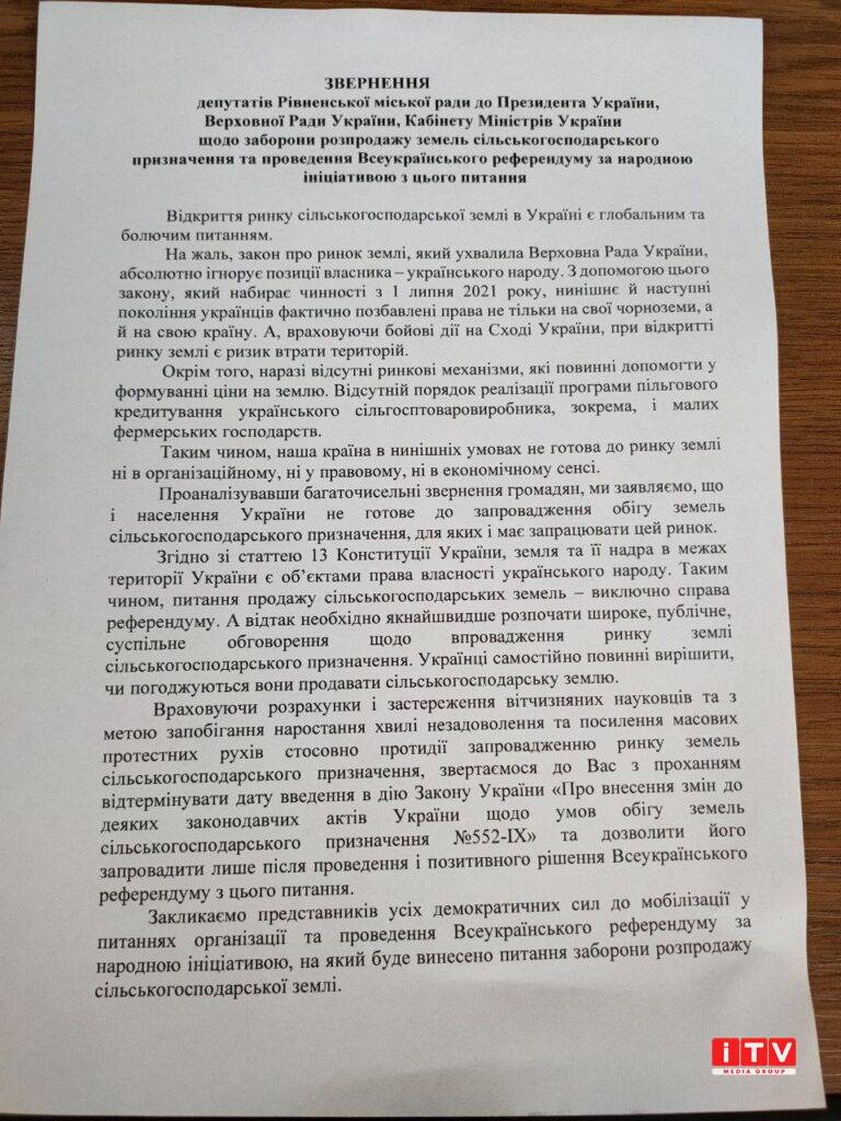 "Закликаємо предстаників усіх демократичних сил мобілізації у питаннях організації до проведення Всеукраїнського референдуму за народноб ініціативою, на який буде винесено питання заборони розпродажу сільськогосподарської землі", - йдеться у зверненні.
