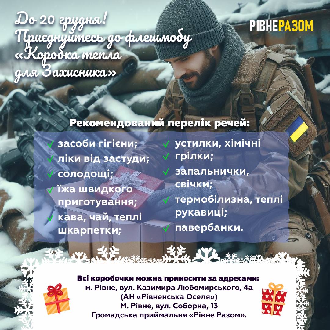 Напередодні Різдва усією Україною шириться флешмоб ««Коробка тепла для Захисника». Його головний посил спрямований на підтримку воїнів на фронті, аби подарувати їм частинку різдвяного тепла. В рамках цієї волонтерської ініціативи всі охочі можуть наповнити звичайну коробочку з-під взуття речами першої необхідності для Героїв та з святковими побажаннями надіслати їх на передову.