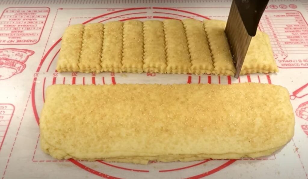 - Розкачуємо тісто, посипаємо цукром і ділимо на два прямокутники. Кожен прямокутник поділяємо на невеликі порційні шматочки.