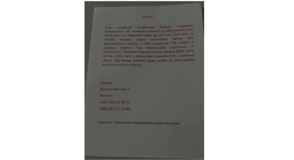 «Всім чоловікам, мешканцям будинку Академіка Грушевського, 38, терміново з’явитися до військкомату для постановки на військовий облік до 24 січня 2024 року… З повагою, Рівненський обласний військовий комісаріат», — йдеться в оголошенні.