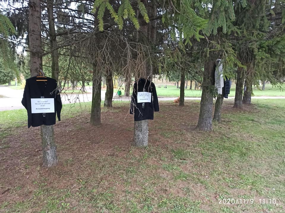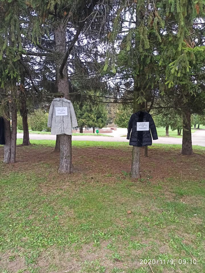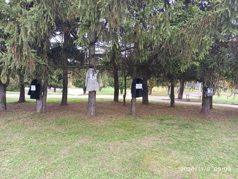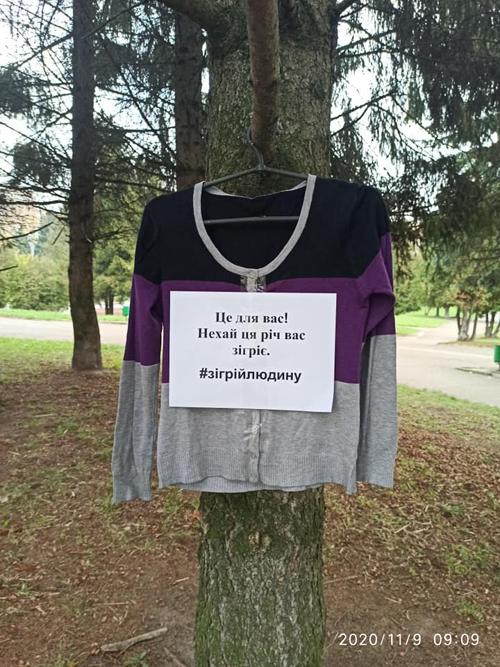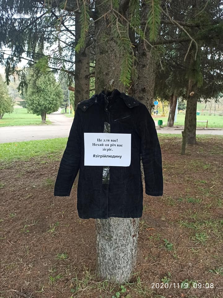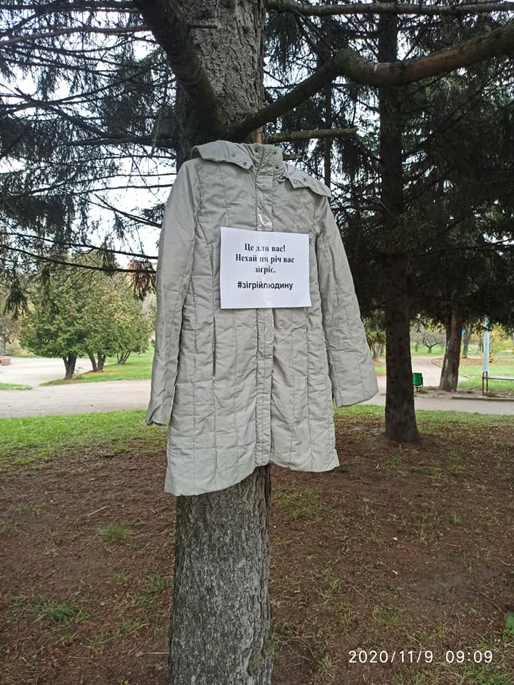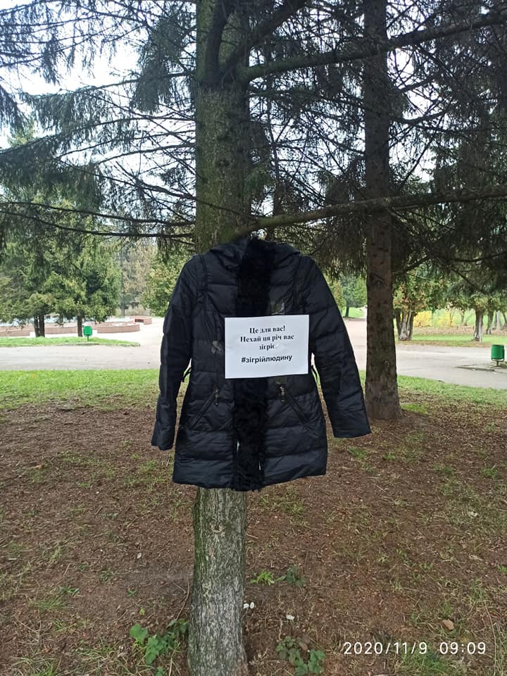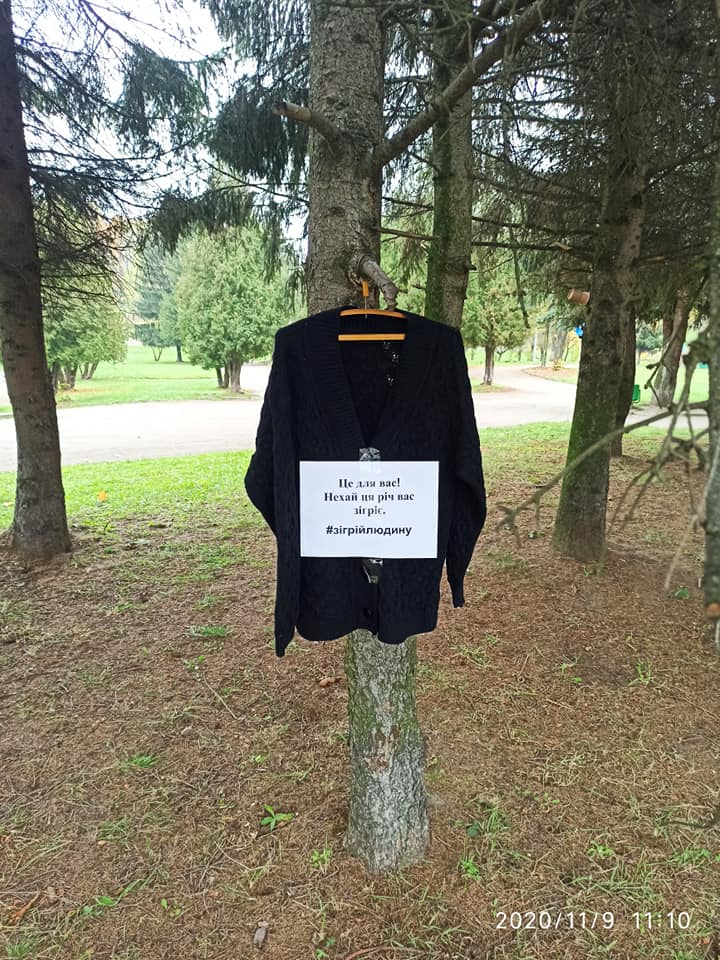 В одному з парків Рівного невідомі розвішали на деревах теплий одяг. Біля кожної речі додали напис : «Це для Вас, нехай ця річ вас зігріє».