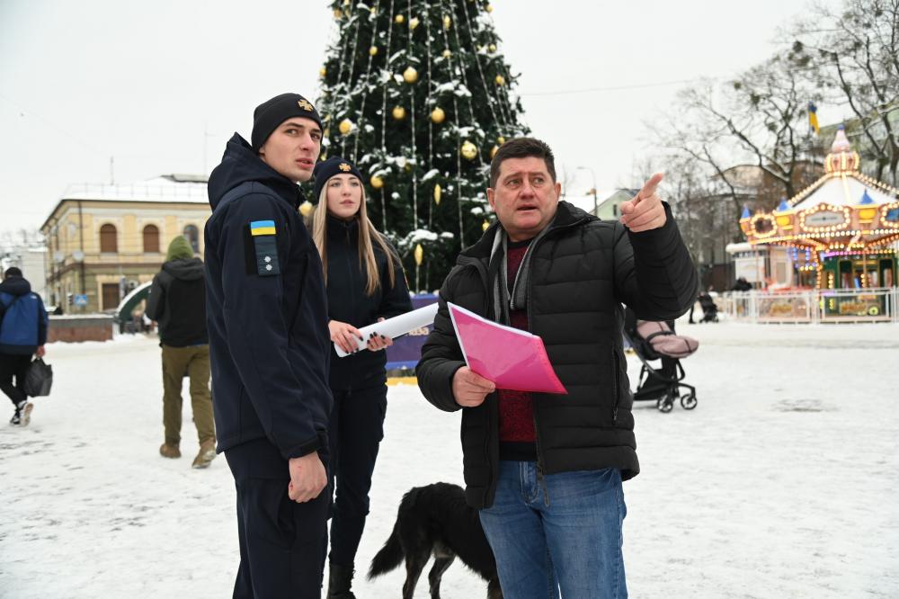 Співробітники ДСНС перевірили правильність встановлення новорічної ялинки та підключення освітлювальних елементів до електромережі. Також перевірили справність первинних засобів пожежогасіння та нагадали працівникам ярмарку порядок дій в разі виникнення пожежі.