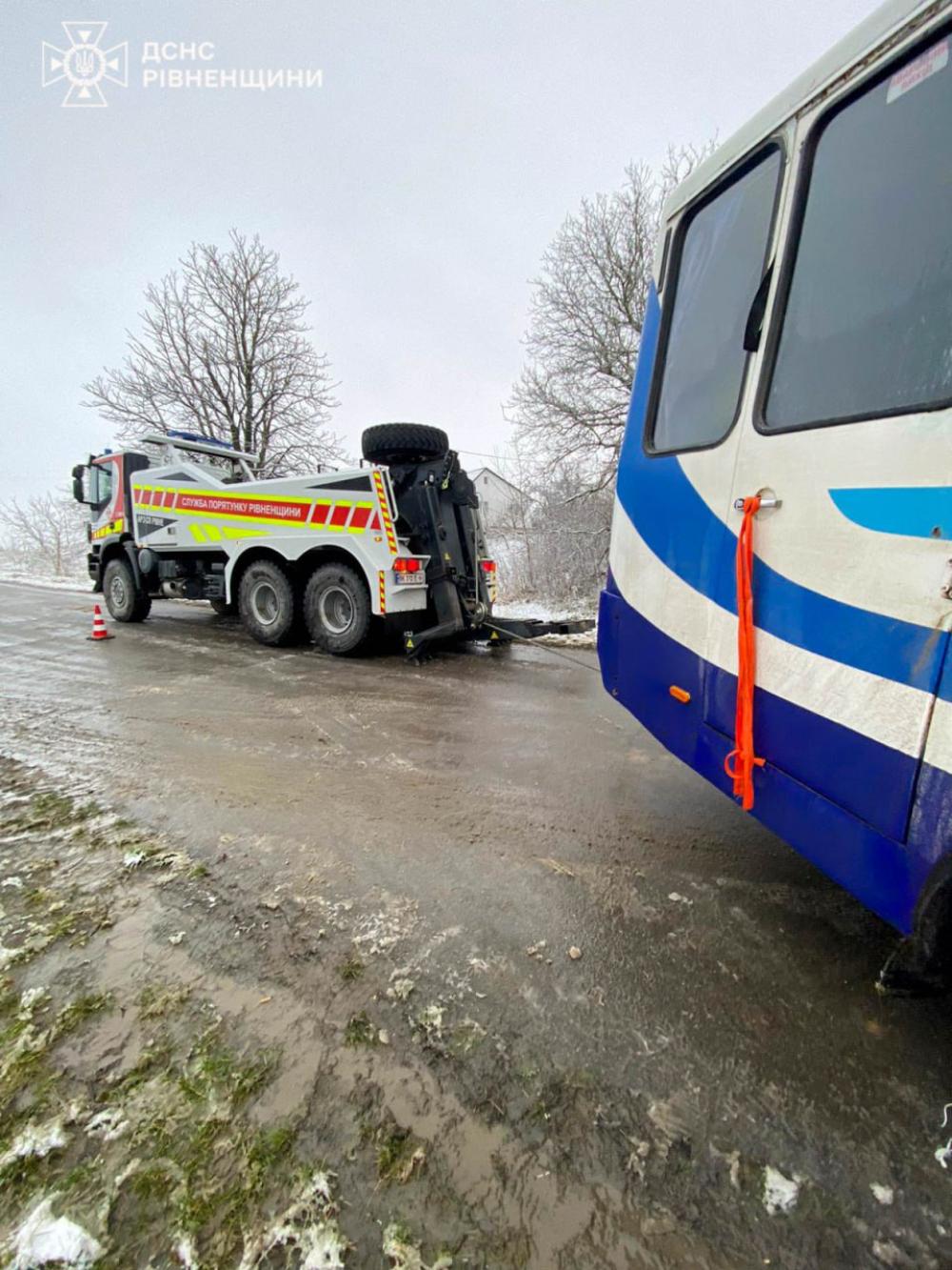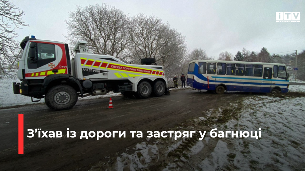 Сьогодні о 07:48 на спецлінію «101» повідомили, що в селищі Тайкури Рівненського району пасажирський автобус з’їхав із дороги та застряг у багнюці.