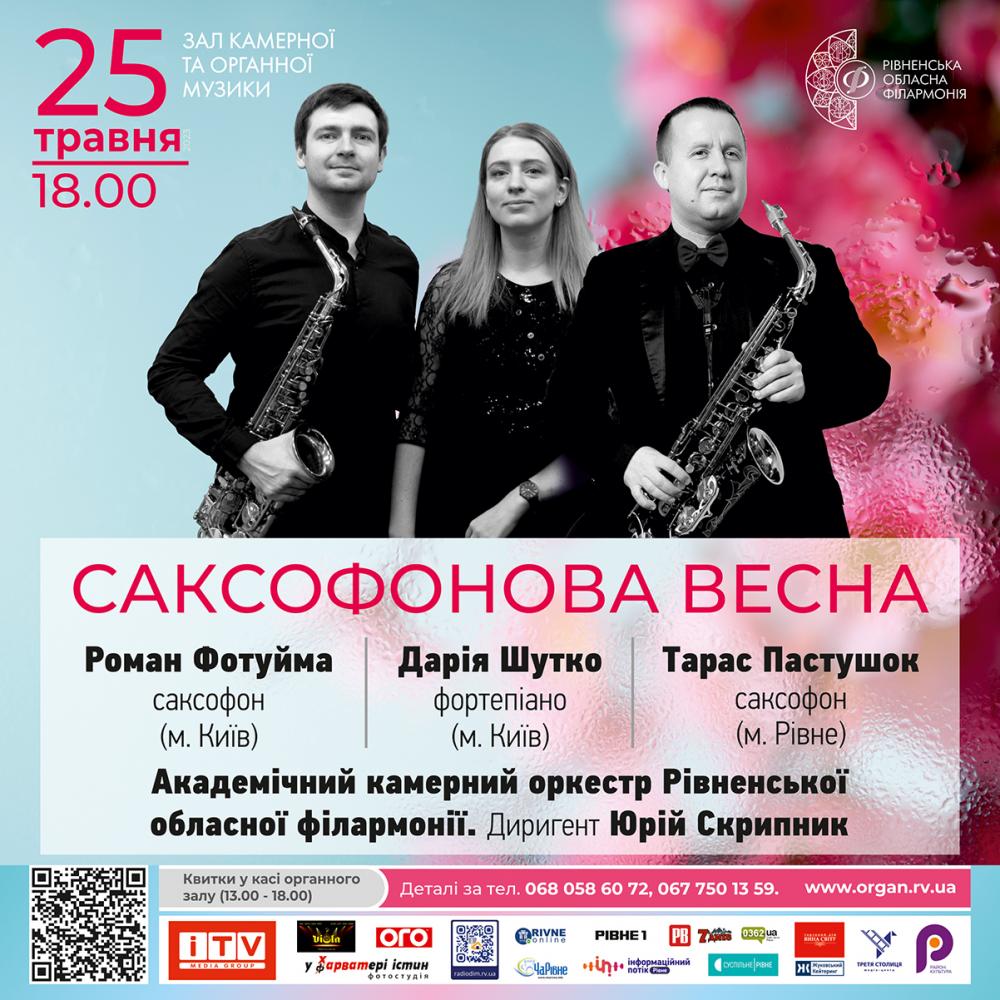 Любителів саксофонової музики запрошують на концерт "Саксофонова весна" Романа Фотуйми і Тараса Пастушка. Захід відбудеться 25 травня о 18:00.
