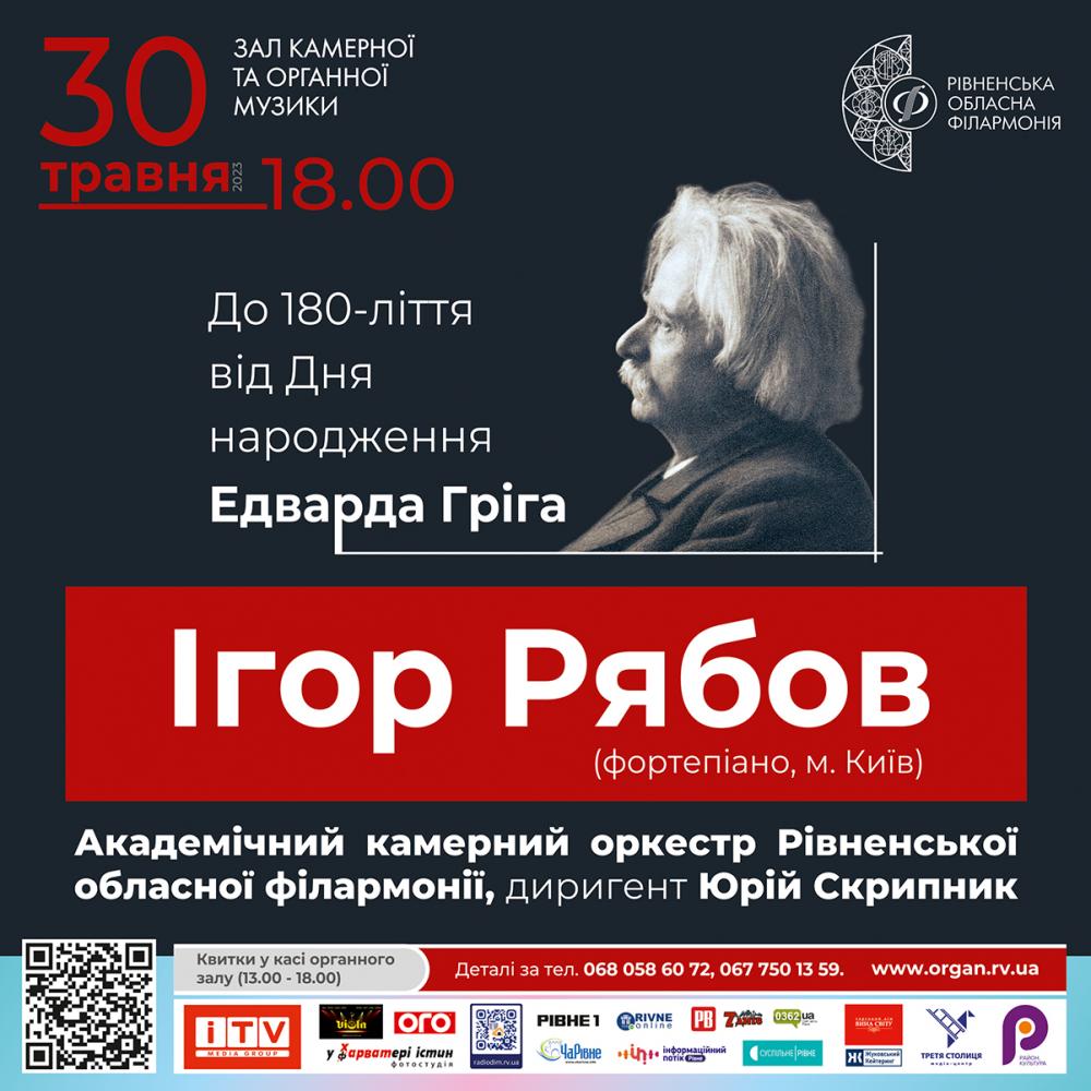 30 травня о 18:00 відбудеться концерт, присвячений 180-літтю Едварда Гріга, виконанні Ігоря Рябова (фортепіано, м. Київ).