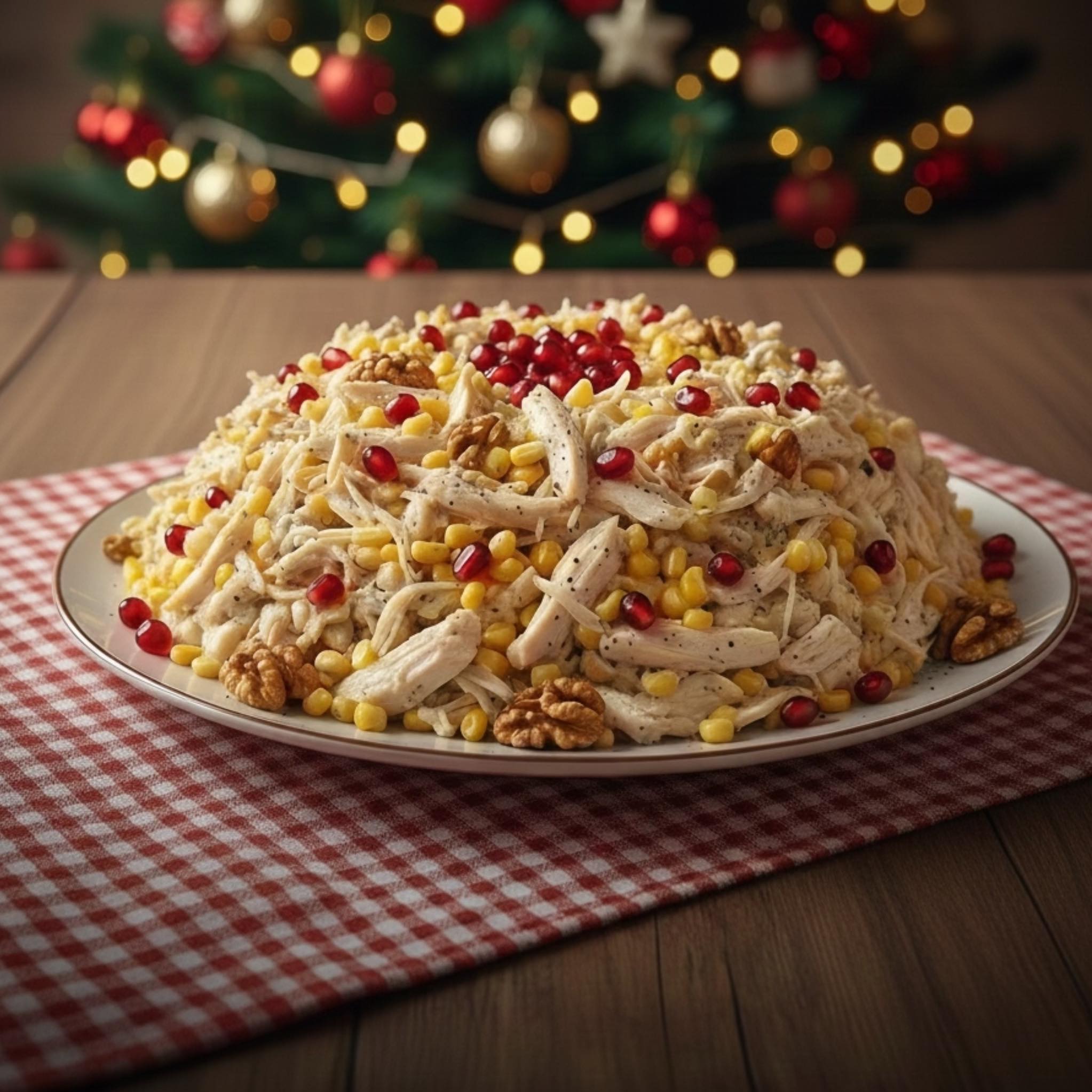 2. Додаємо: До курки додаємо підсмажені та подрібнені волоські горіхи, консервовану кукурудзу та пропускаємо через прес часник.
