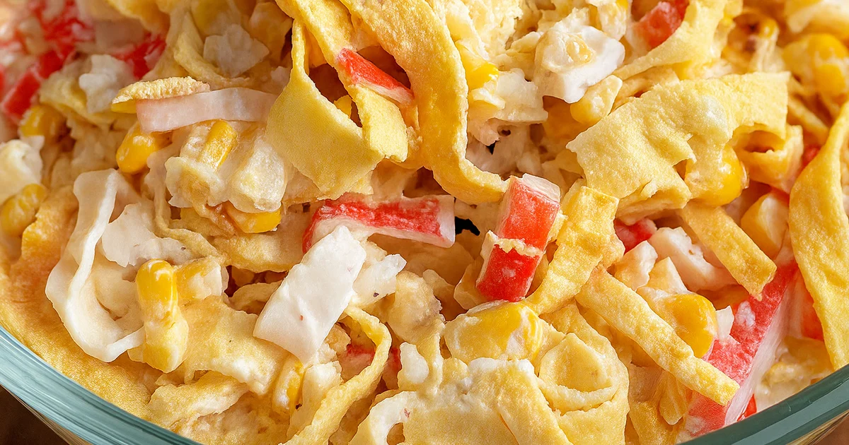 У великій мисці поєднайте рис, кукурудзу, крабові палички та смужки омлету.