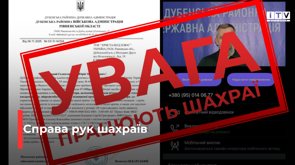 "Це — фейк. Дубенська районна військова адміністрація жодних таких звернень не надсилає. З цього самого номера також телефонують, представляючись начальником Дубенського РТЦК та СП, і просять переказати кошти "на потреби військових", - йдеться у повідомленні.