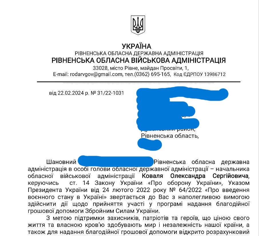 До підприємців Рівненщини почали надходити листи від імені начальника Рівненської ОВА з «наполегливою вимогою» взяти участь у «програмі надання благодійної грошової допомоги Збройним Силам України». За це підприємці буцімто отримають зменшення податку на прибуток.