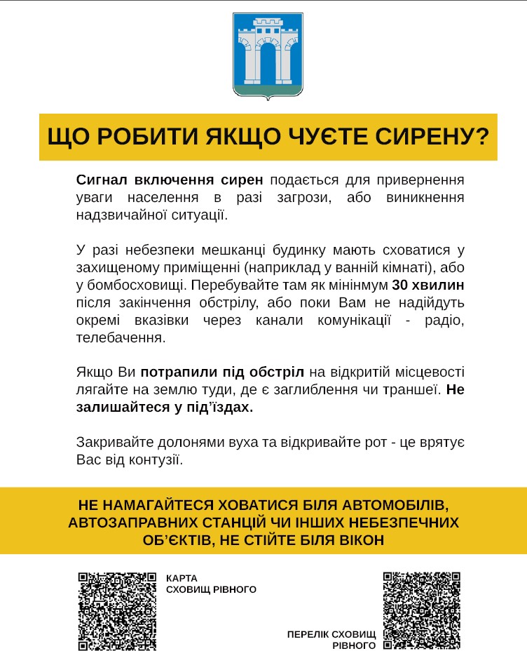 Що робити, якщо чуєте звук сирен? 25 лютого 2022, 17:00 1290 У Рівному опублікували рекомендації для населення, як діяти коли чуєте сирену?