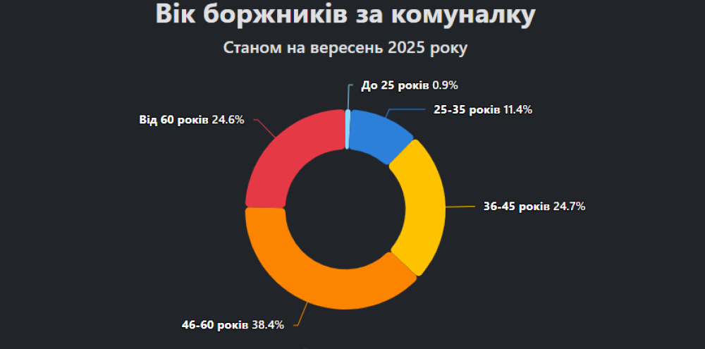 Основний тягар комунальних боргів припадає на людей, віком 46–60 років — 302,8 тисячі проваджень (38%). На другому місці група 36–45 років із 194,7 тис. провадженнями (25%). Майже стільки ж боргів у людей старших за 60 років — 194,1 тисячі (25%).